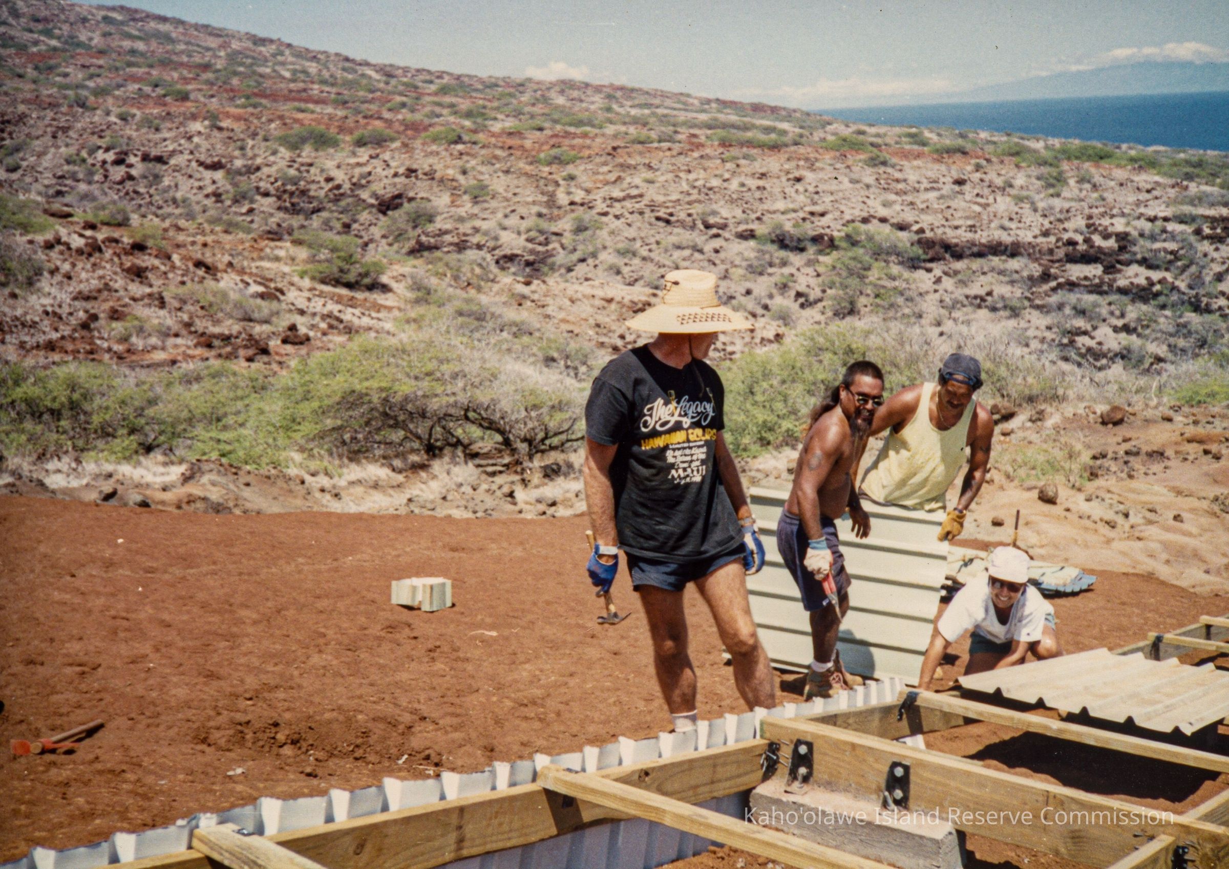 Color photograph of four unidentified people working on applying metal siding to the base of a water catchment structure.