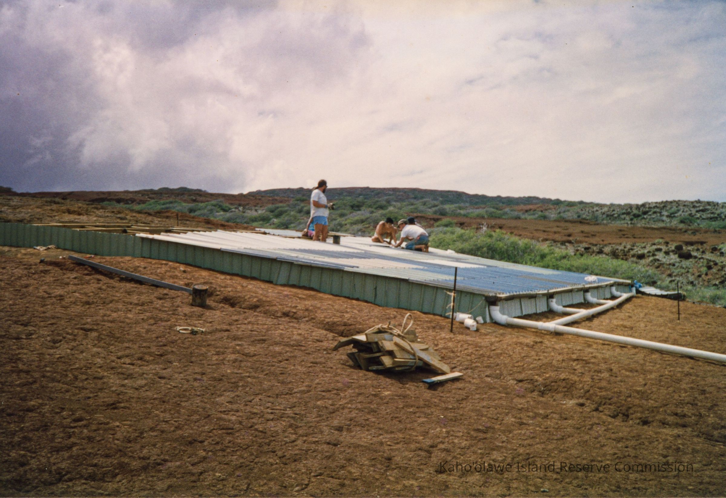 Color photograph of several unidentified people working on the top of a partially constructed water catchment structure. The structure sits on hardpan terrain. Several PVC (polyvinyl chloride) pipes are connected to it. There is also construction material near it.
