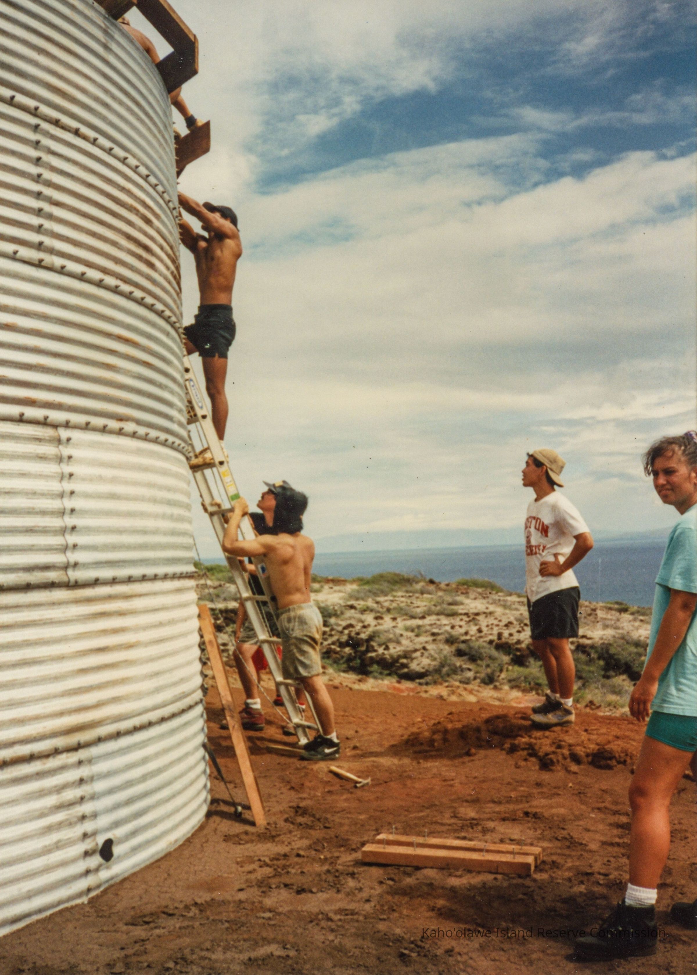 Color photo of a group of unidentified people working on a water catchment structure. One man is standing on a ladder leaning against the structure. Two men are supporting the ladder. One man looks on while a woman looks at the cameral. This photo was probably taken at Wailuna in Hakioawa 'Ili.