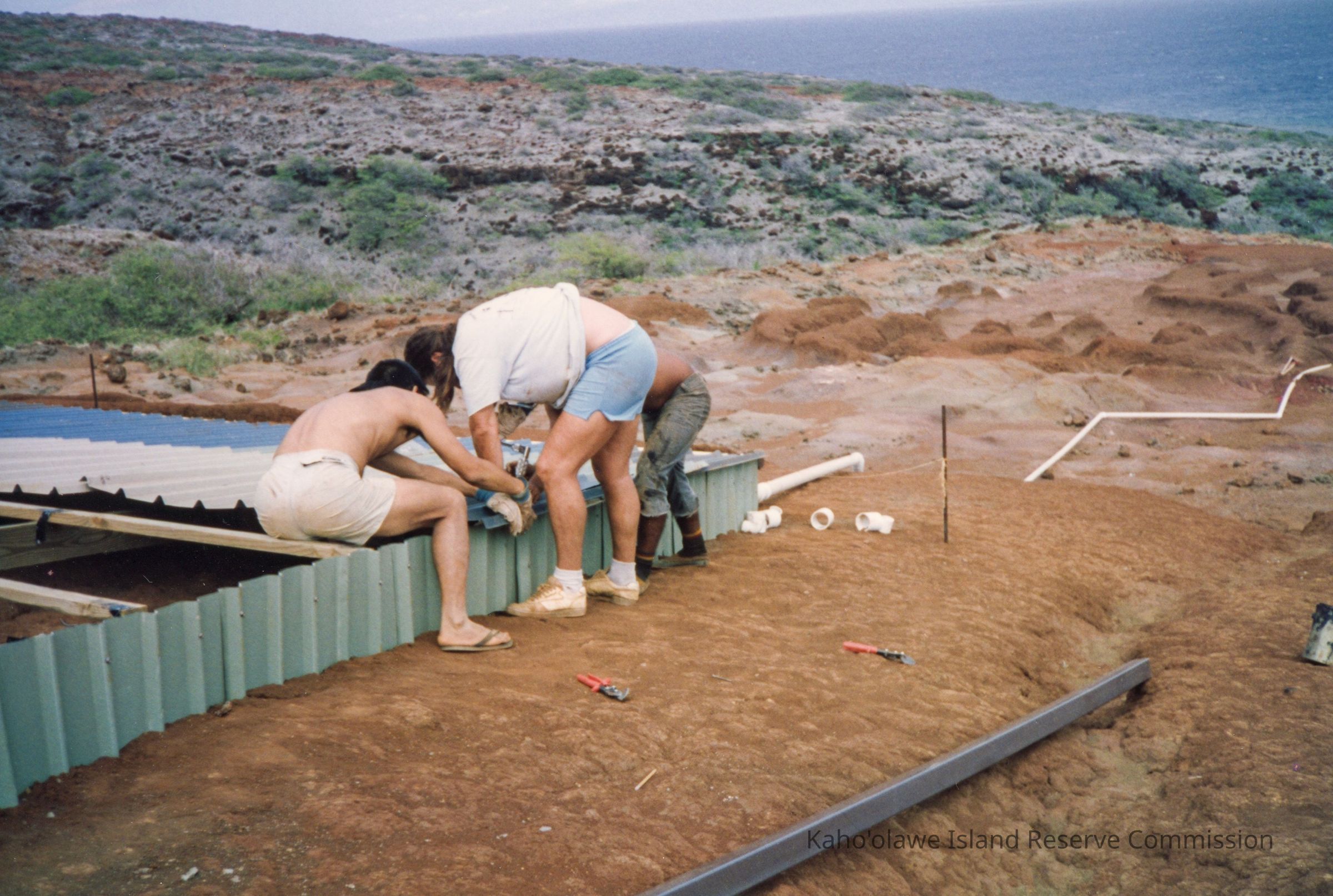 Color photograph of three unidentified people working on a water catchment structure. It is set on hardpan with PVC (polyvinyl chloride) pipe connected to it.