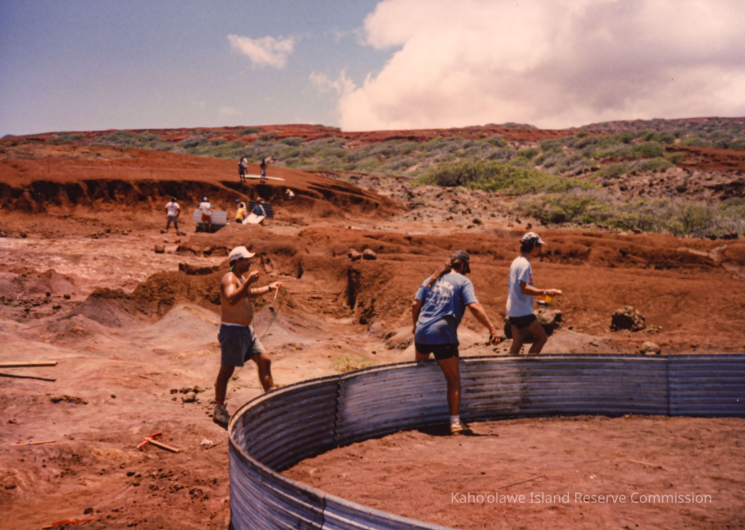 Color photo of three people building the base of a metal water catchment. There is a group of people in the far distance organizing construction supplies. This photo may have been taken during the Protect Kaho'olawe 'Ohana (PKO) access to build a water catchment. It may have been taken at Wailuna in Hakioawa 'Ili.