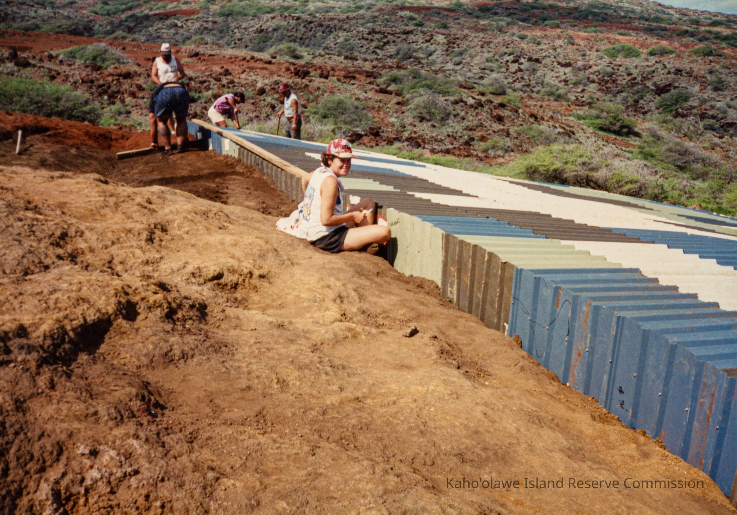 Color photograph of a group of unidentified people working on a water catchment structure situated on hardpan terrain.