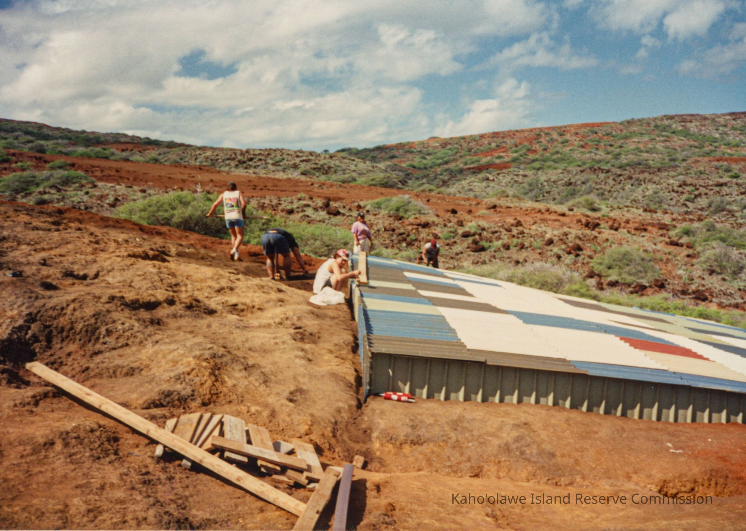 A group of people work on constructing a water catchment structure on hardpan in a rugged, hilly landscape under a partly cloudy sky.
