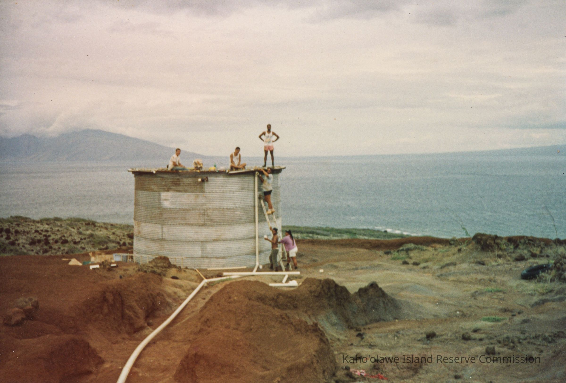 Color photograph of a group of unidentified people working on a corrugated metal water tank. Photo was taken from a distance.
