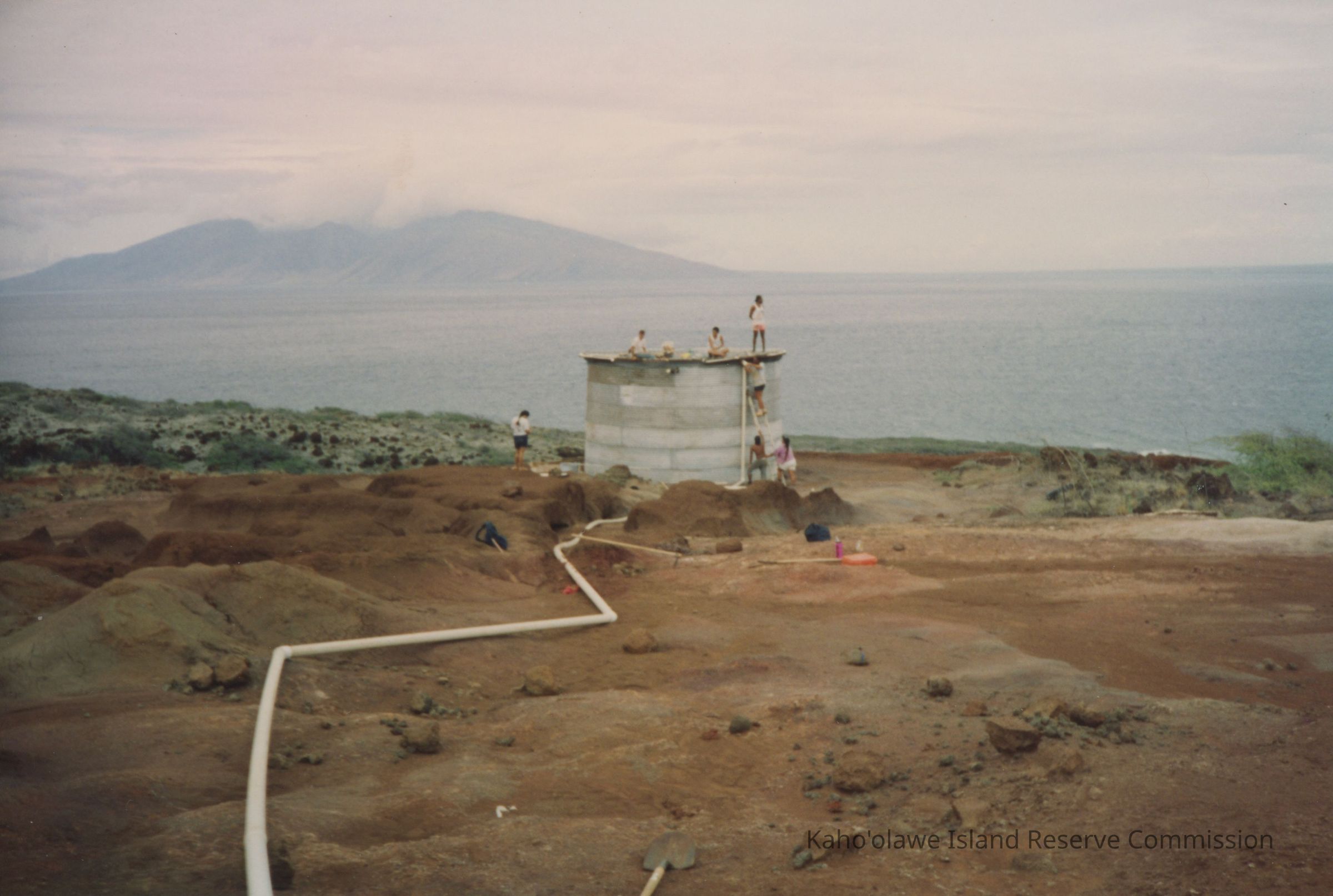Distant view of a group of unidentified people working on a corrugated metal water tank set on hardpan terrain. The ocean and Maui are in the background.