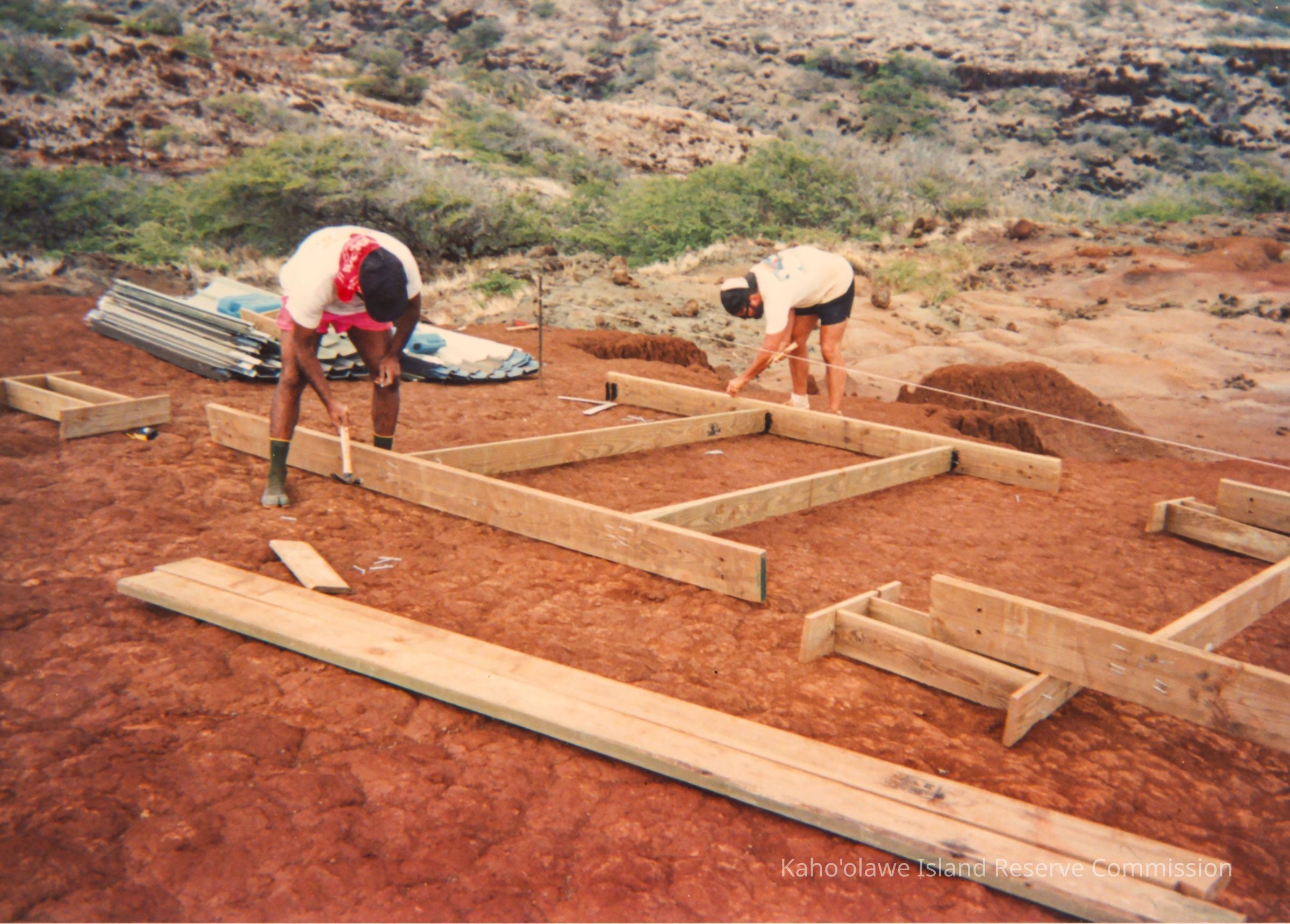 Color photo of two unidentified people hammering on a wooden form. The form is on hardpan terrain. This photo was probably taken during 1993 PKO (Protect Kaho'olawe 'Ohana) access to build a water catchment.
