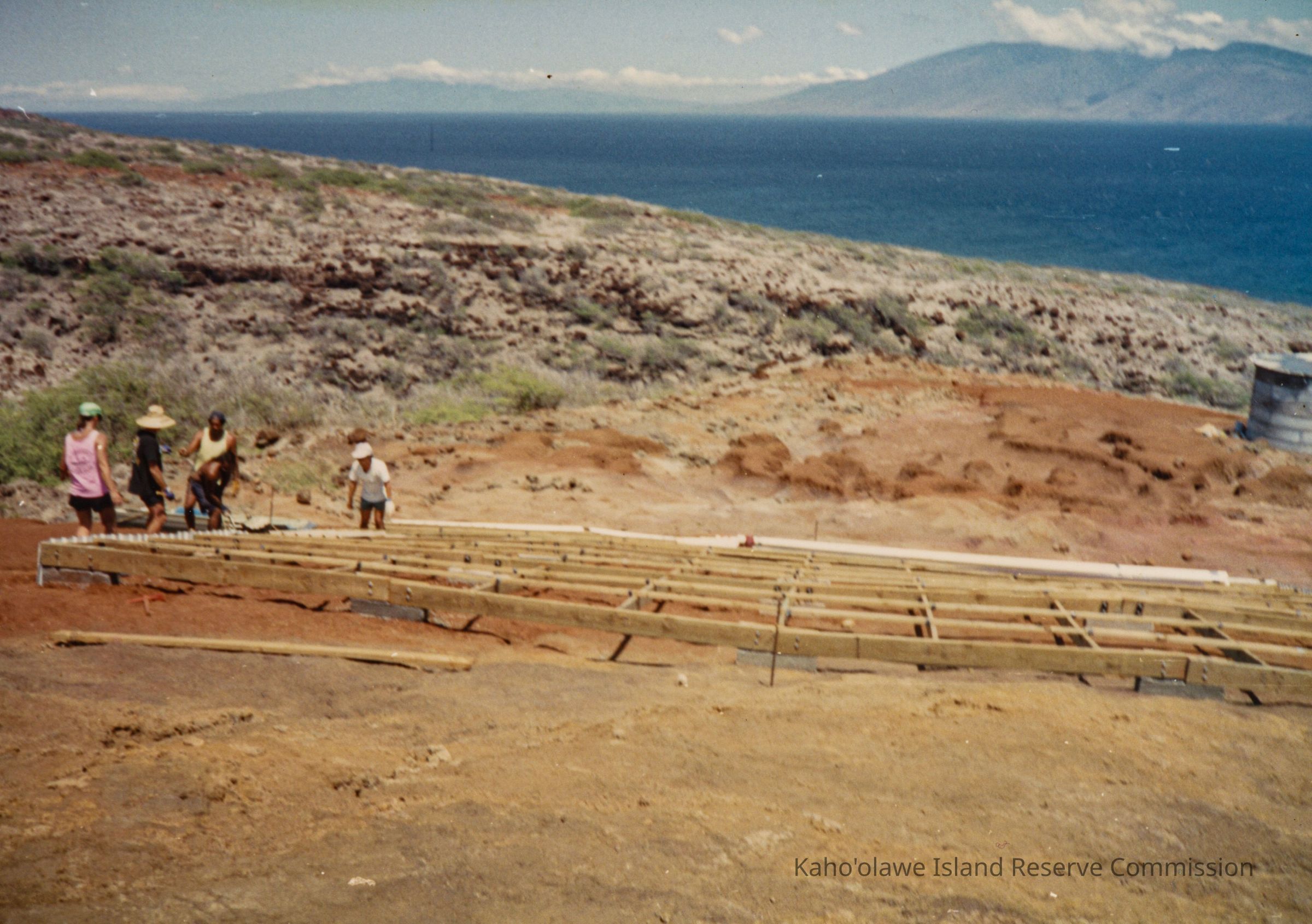 Color photograph of a group of unidentified people working at a wooden frame of a water catchment structure situated on hardpan terrain.