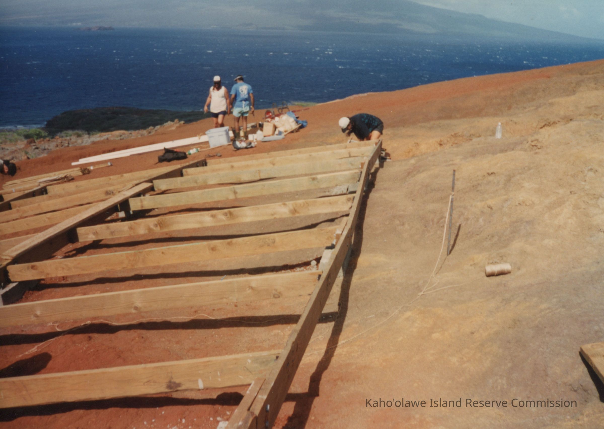 On a coastal hillside, a construction project unfolds as three people prepare materials, with the ocean and distant island in view.