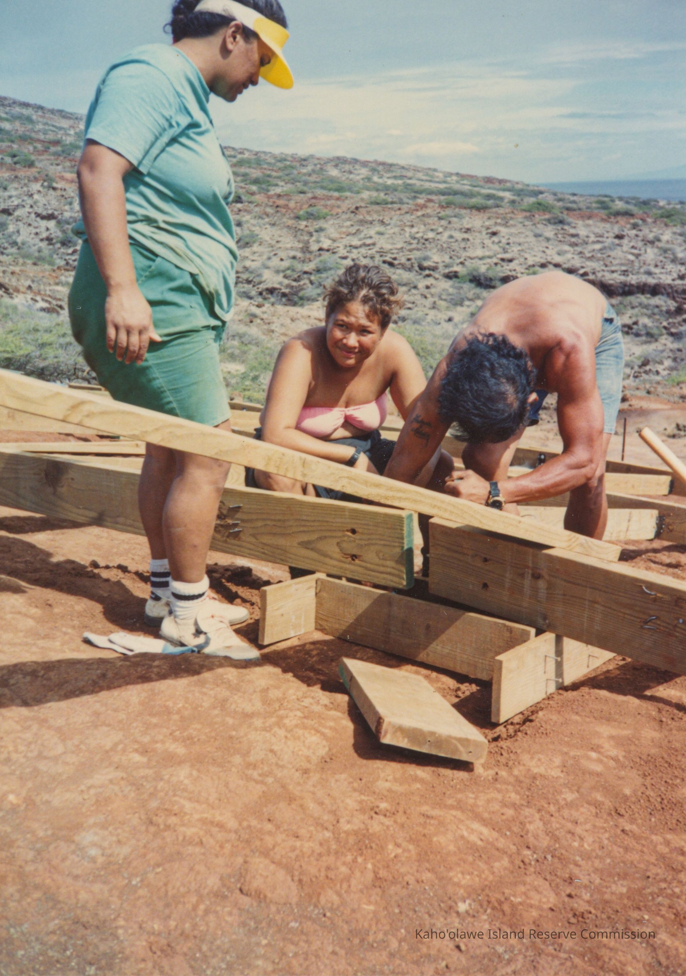 In the image, three adults are observed at a construction hardpan site, with one man actively working on assembling wooden frames on a sunny day.