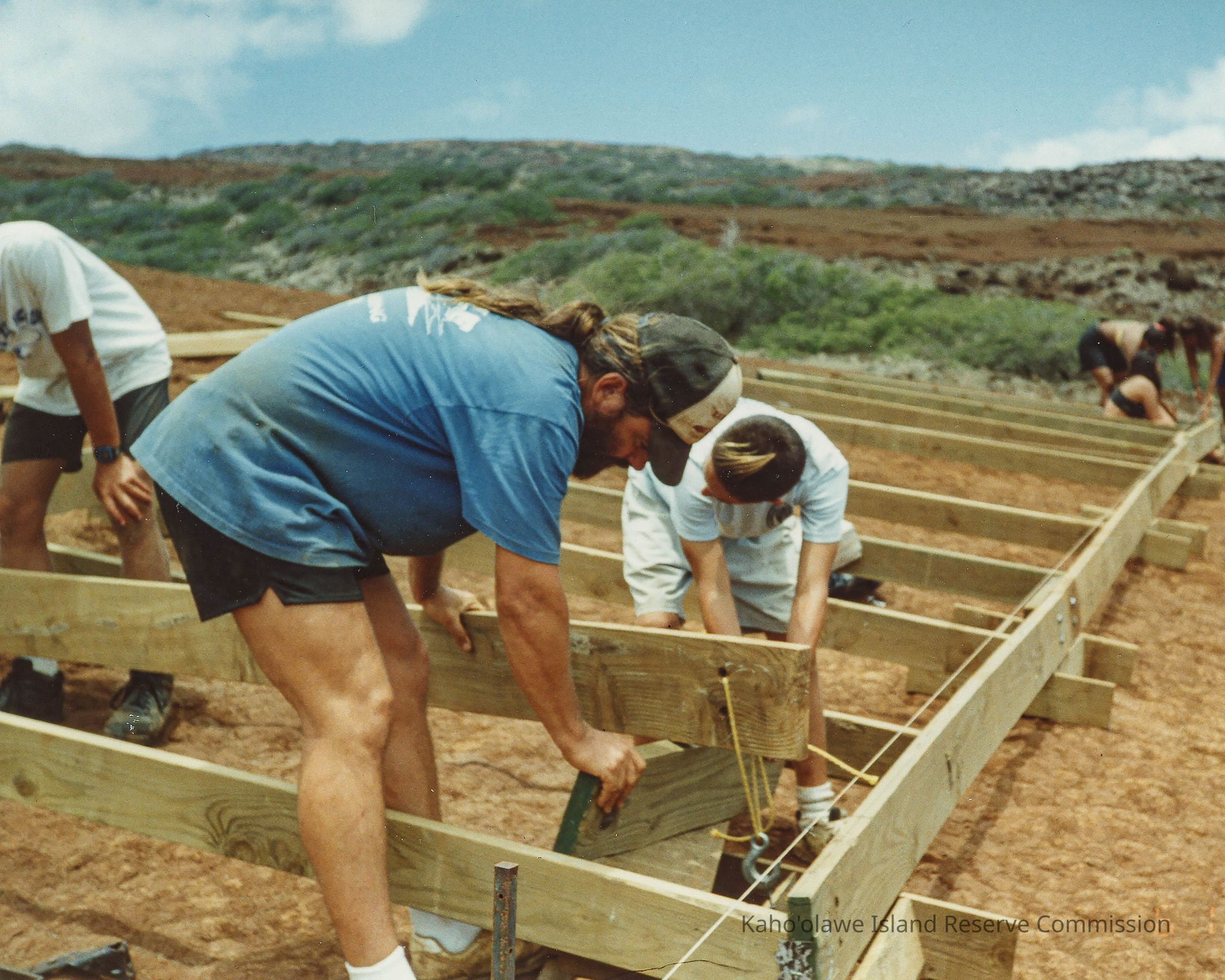 Color cropped photo of a group of unidentified people constructing a wooden frame on hardpan. This photo may have been taken at Wailuna in Hakioawa 'Ili.