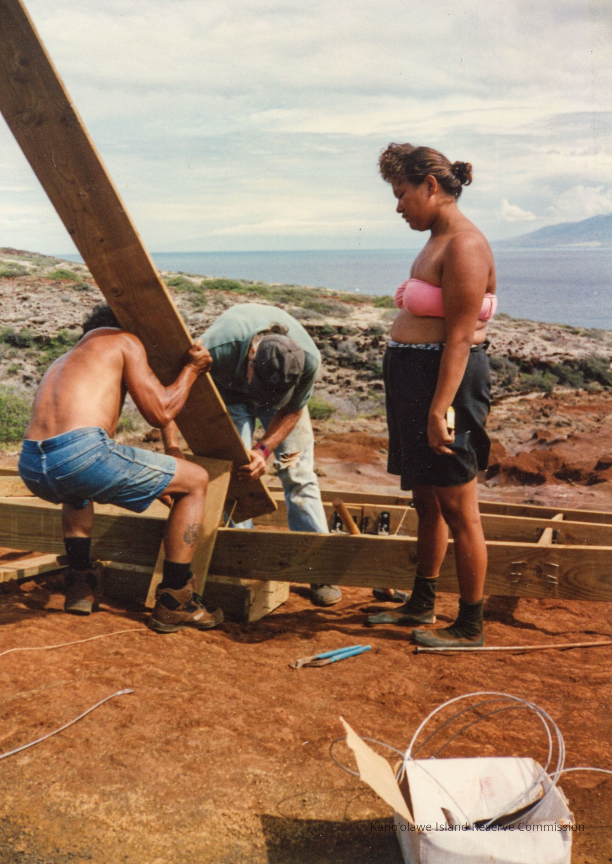 Color photo of three unidentified people working on a wooden frame on hardpan terrain. Two men are placing a wooden plank onto the frame with a woman looking on.