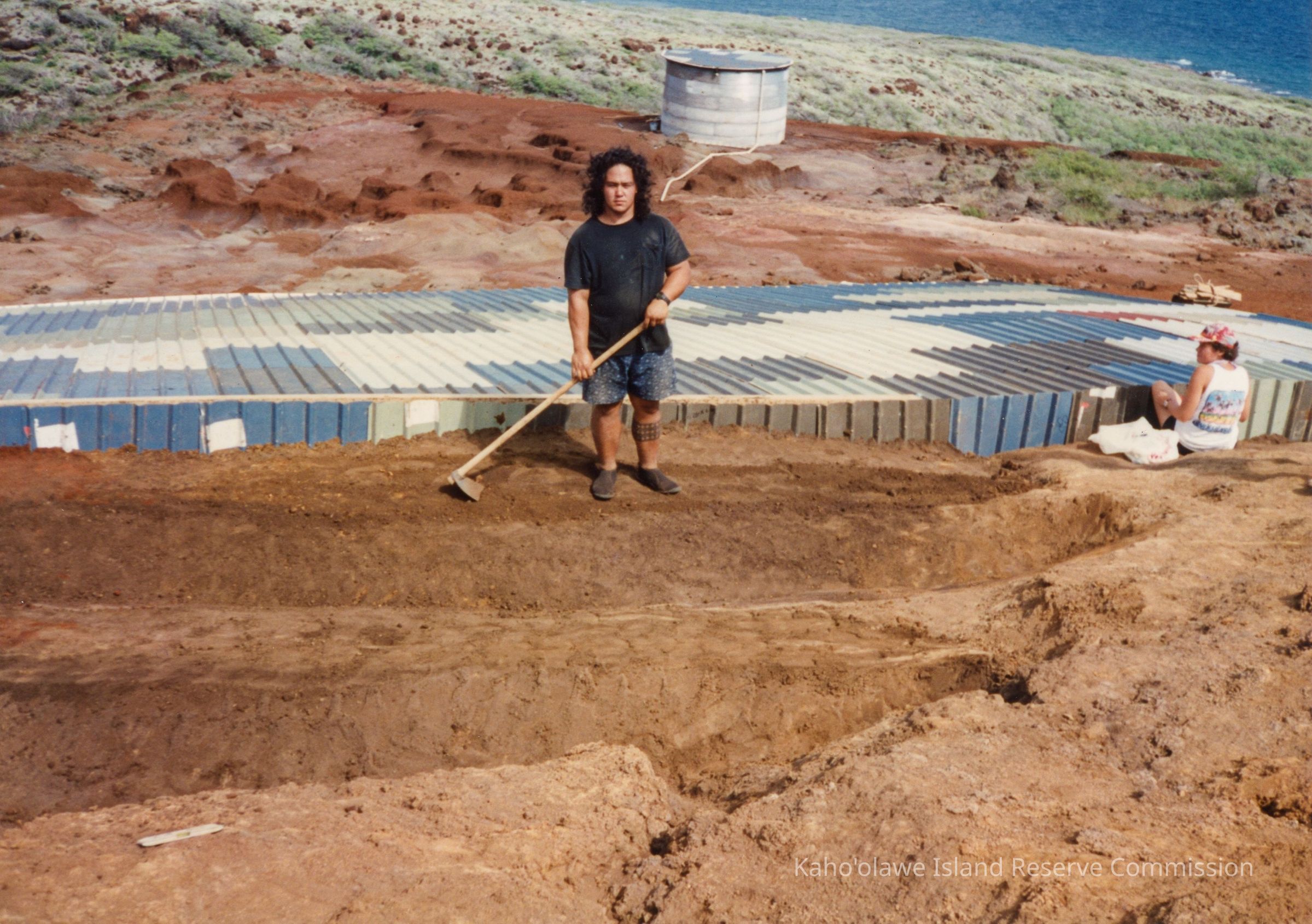 A person stands on a construction site holding a hoe, while another sits nearby, on hardpan.