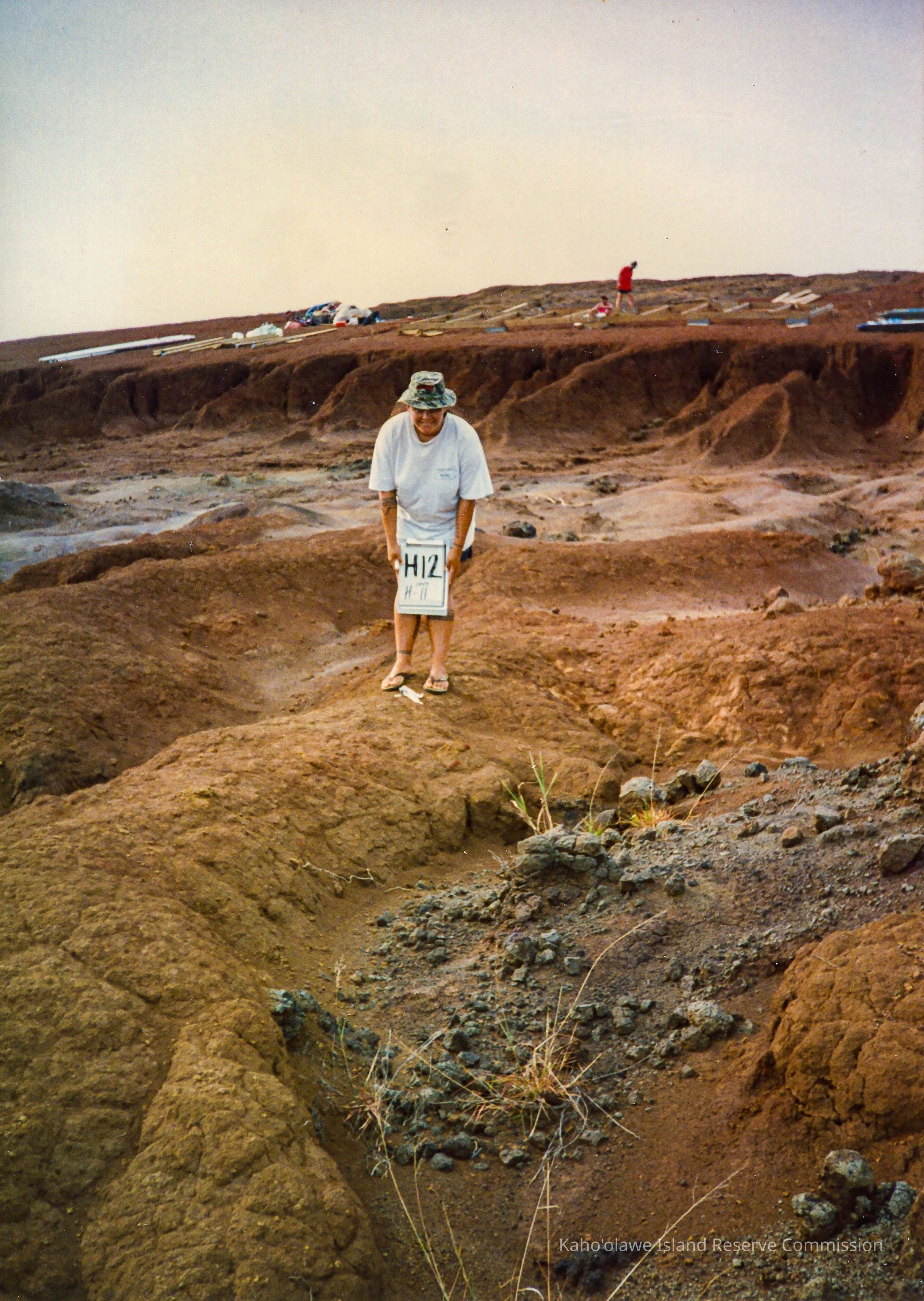 Color photo of an unidentified person holding a sign labeled H12 near a potential burn site or archaeological site on undulating hardpan terrain. There are unidentified people in the far background amongst construction materials on a small elevated ridge of hardpan. This photo was probably taken at Wailuna in Hakioawa 'Ili.Photograph Details