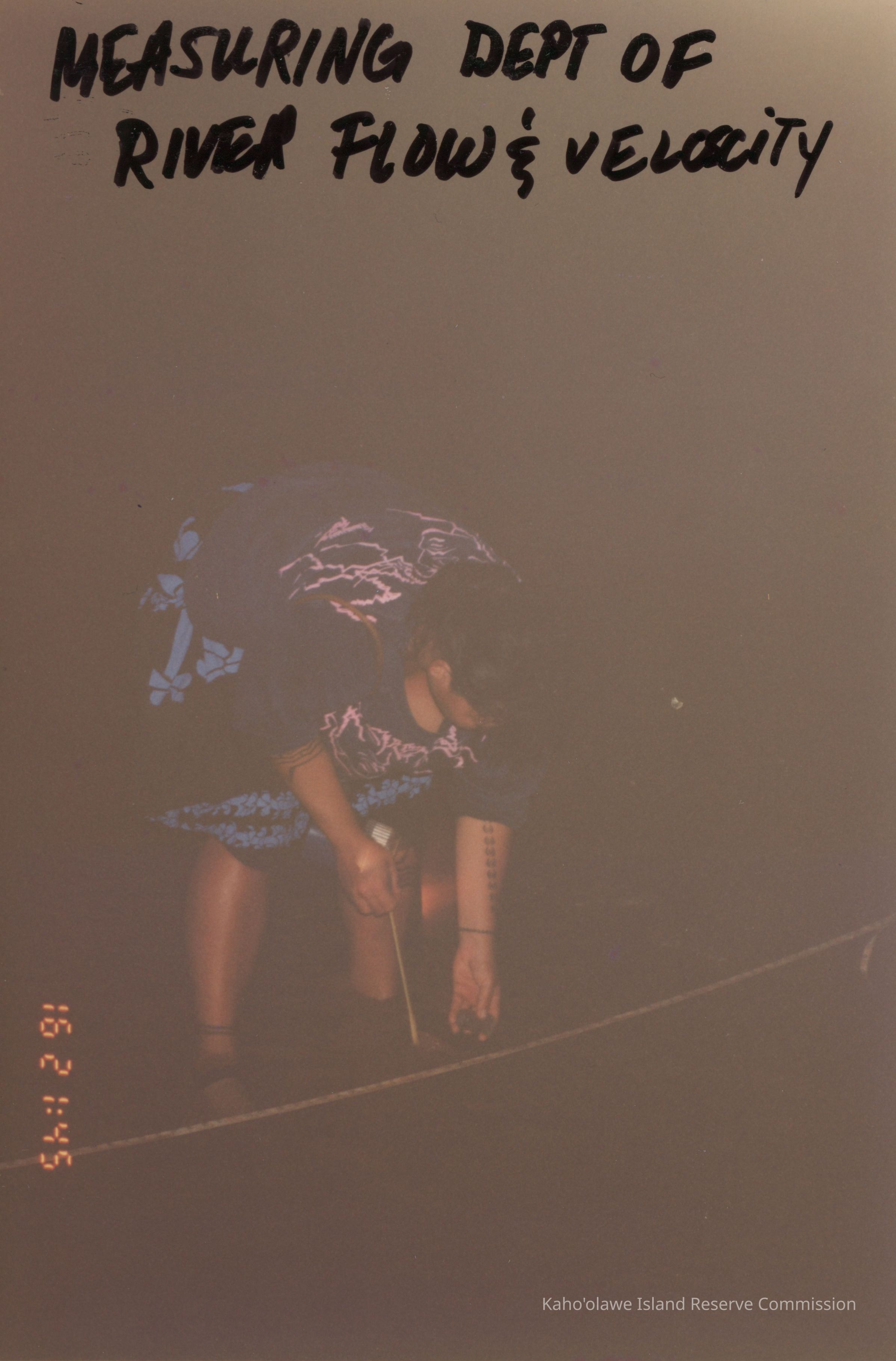 Color photograph of an unidentified person bending over and measuring the depth and velocity of a river (probably Hakioawa Stream) in the dark.
