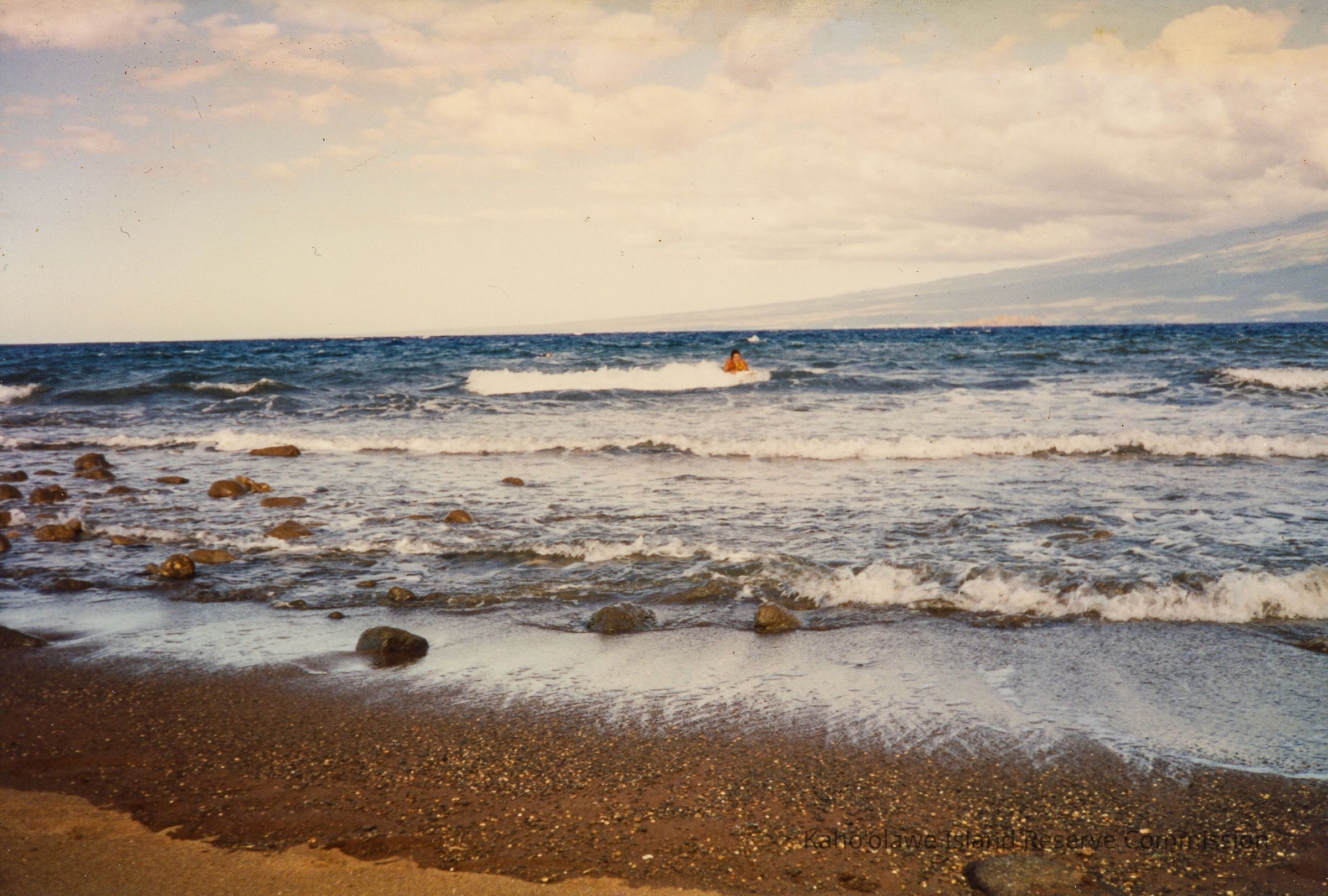A color photo of an unidentified person riding on a boogie board on a choppy wave from a distance. There was a hand-written notation on a page several pages before the page which originally stored this photo. It read: "November 14-17 1993; Advance Crew Before Makahiki." This photo was probably taken at Hakioawa Bay in Hakioawa 'Ili.