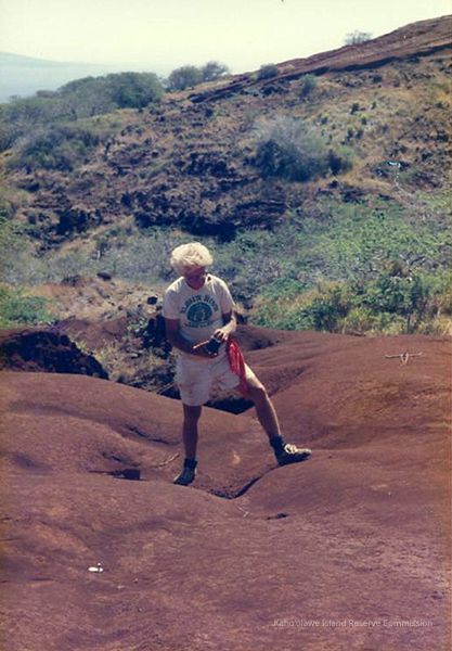 Color photo of an unidentified person with a spool of rope or twine on hard pan, possibly constructing a check dam near Lua 'O Kealialuna. Photo taken during Legal Aid Society (Moloka'i) access.