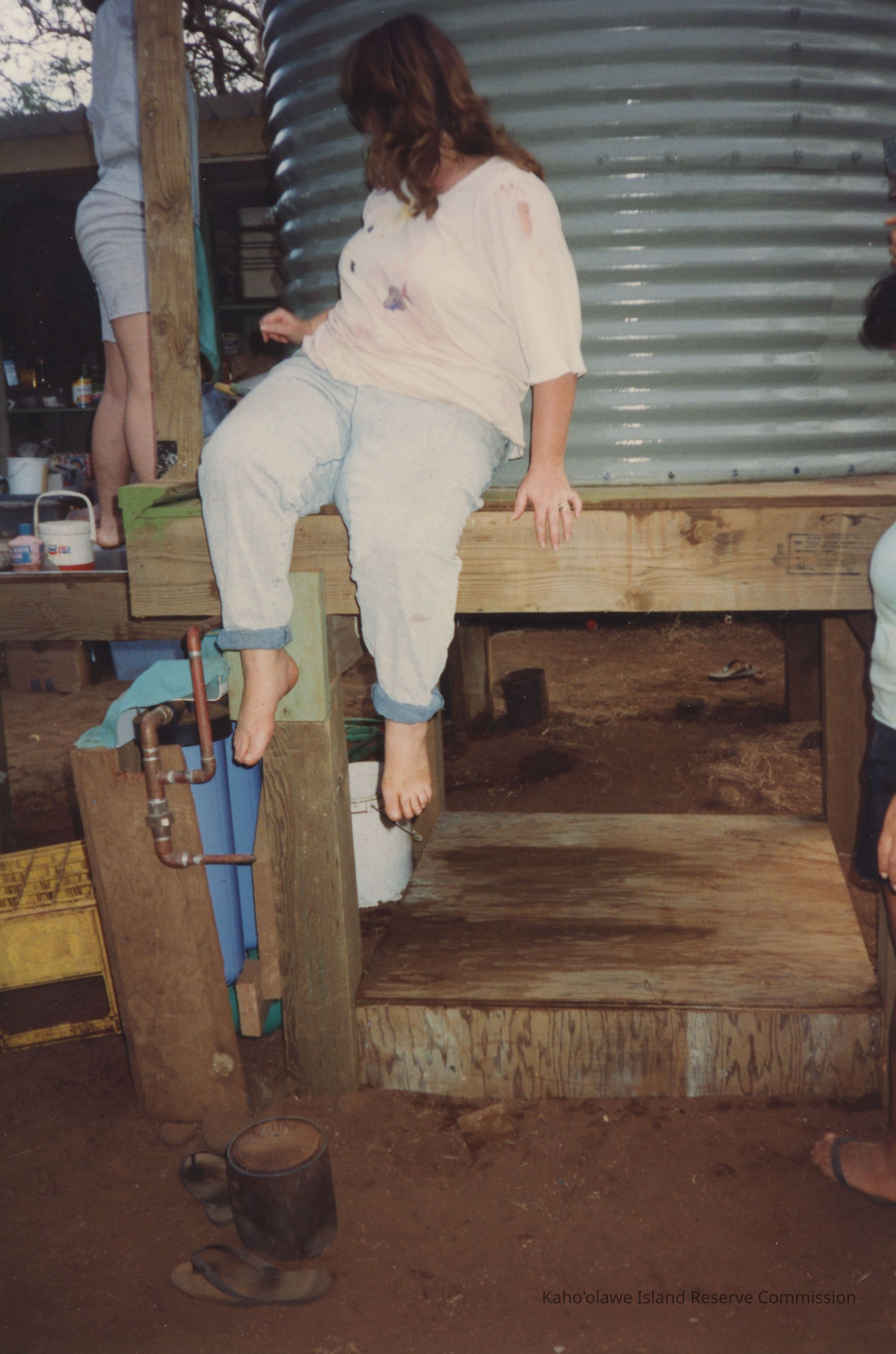 A woman sits on a wooden platform beside a large water tank, near a system of connected pipes, possibly used for water catchment.