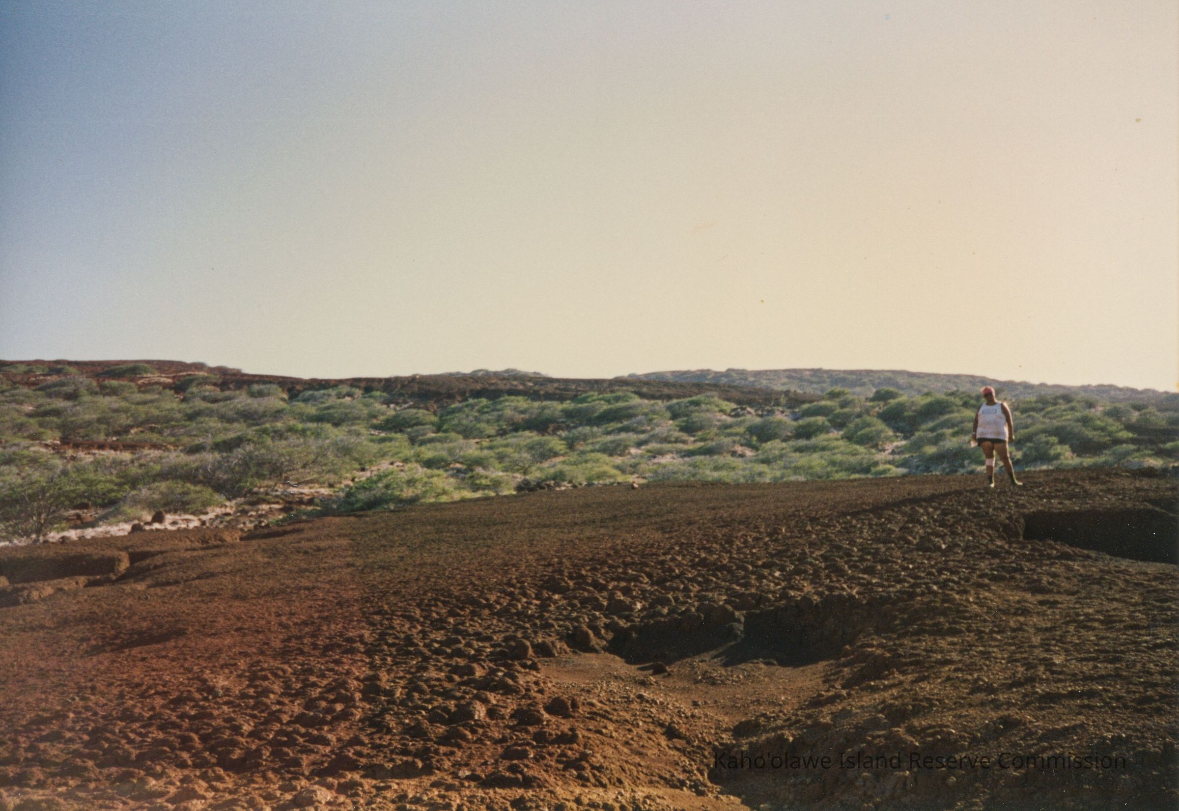 A person stands on a rugged, dry hardpan landscape with sparse vegetation and a distant horizon under a clear sky.