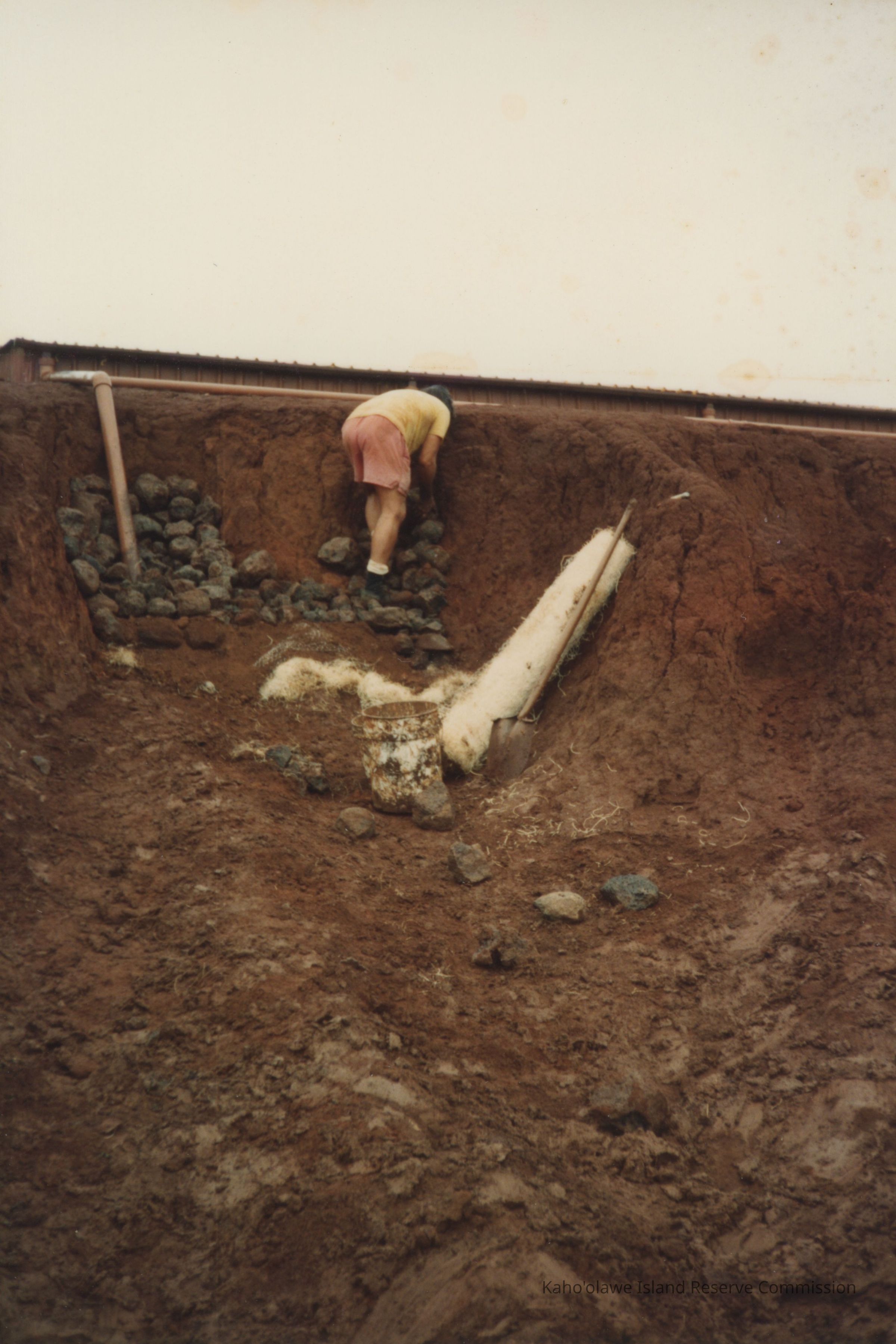 Color photograph of an unidentified person working on the head of check dam stacking rocks on hardpan. There is a roll of fabric matting in the foreground. There is a pipe running into part of the check dam. Handwritten text on previous page in the original photo album states: "March 1994 3 Day Regular Access. Tank Cover Flew Off!"