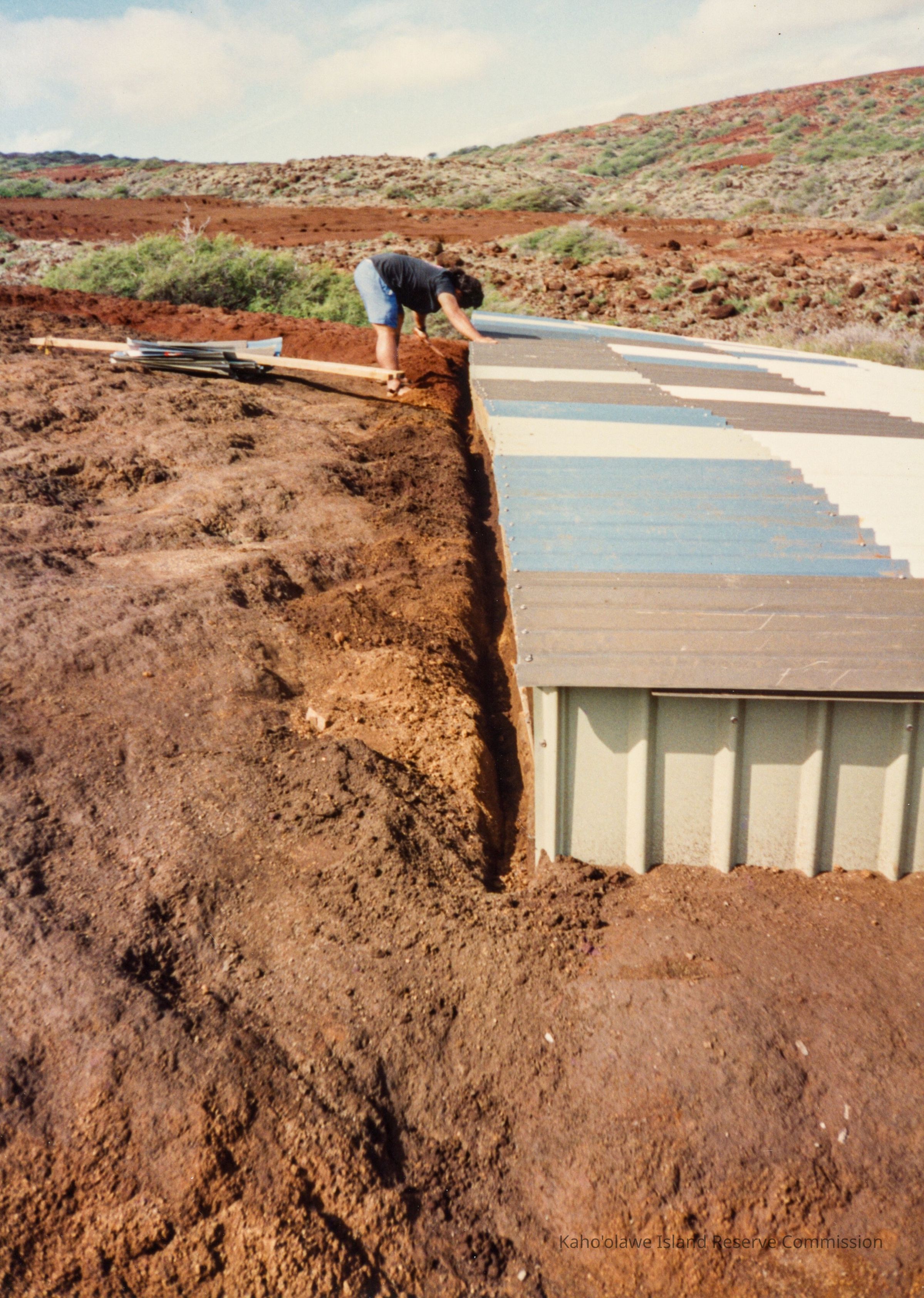A person is constructing a water catchment structure, using corrugated metal, surrounded by earthy hardpan terrain and sparse vegetation.