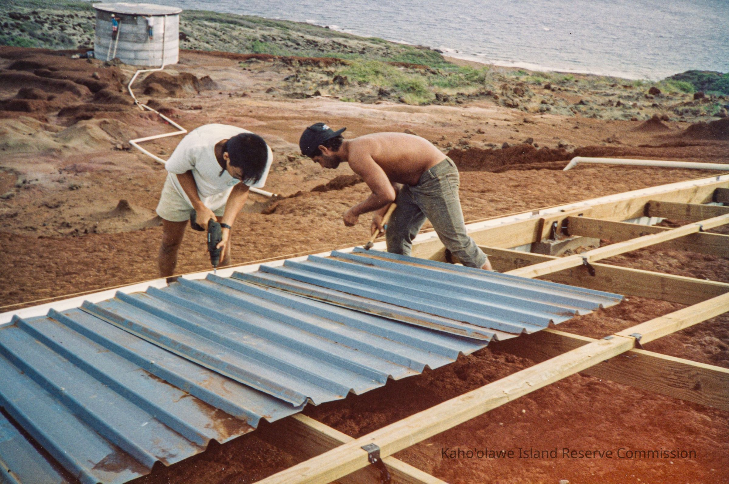 Color photograph of two unidentified people installing corrugated metal siding to wooden frame of water catchment structure. Two people are working on a water tank below with the ocean in the far background.