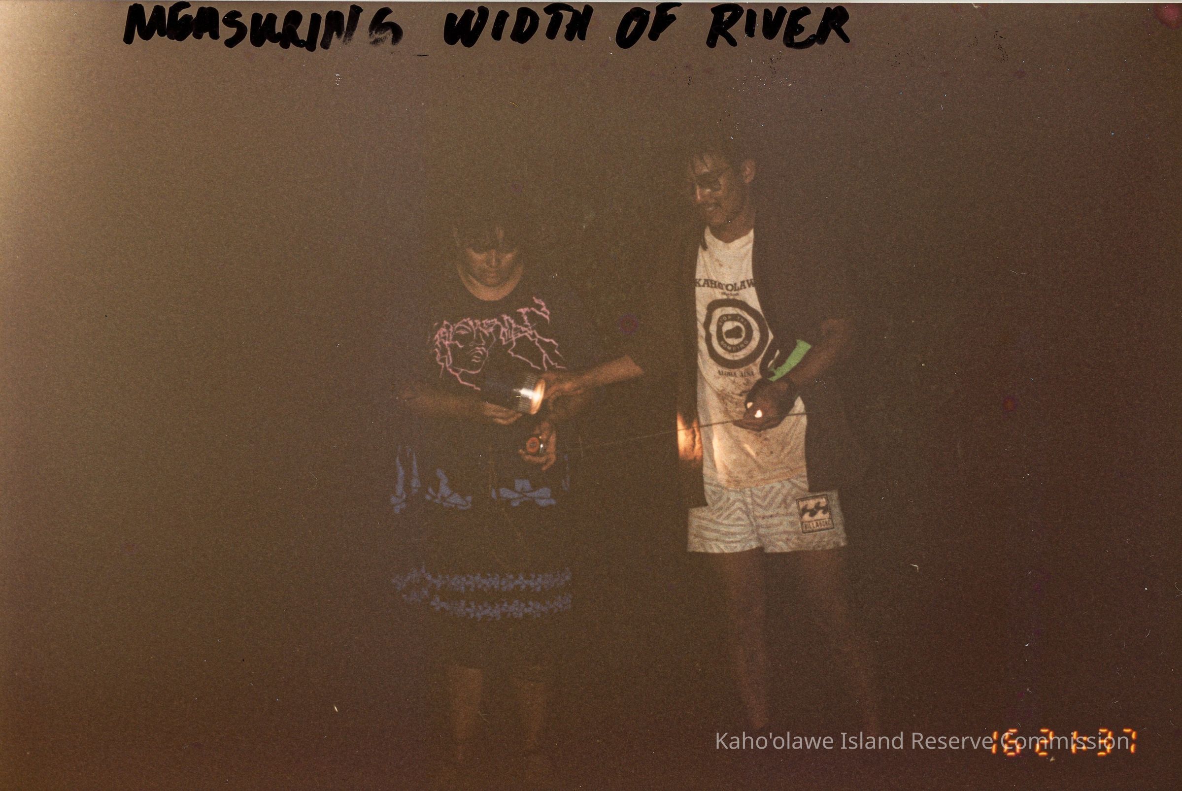 Color photograph of two unidentified people measuring the width of a river (probably Hakioawa Stream) in the dark.
