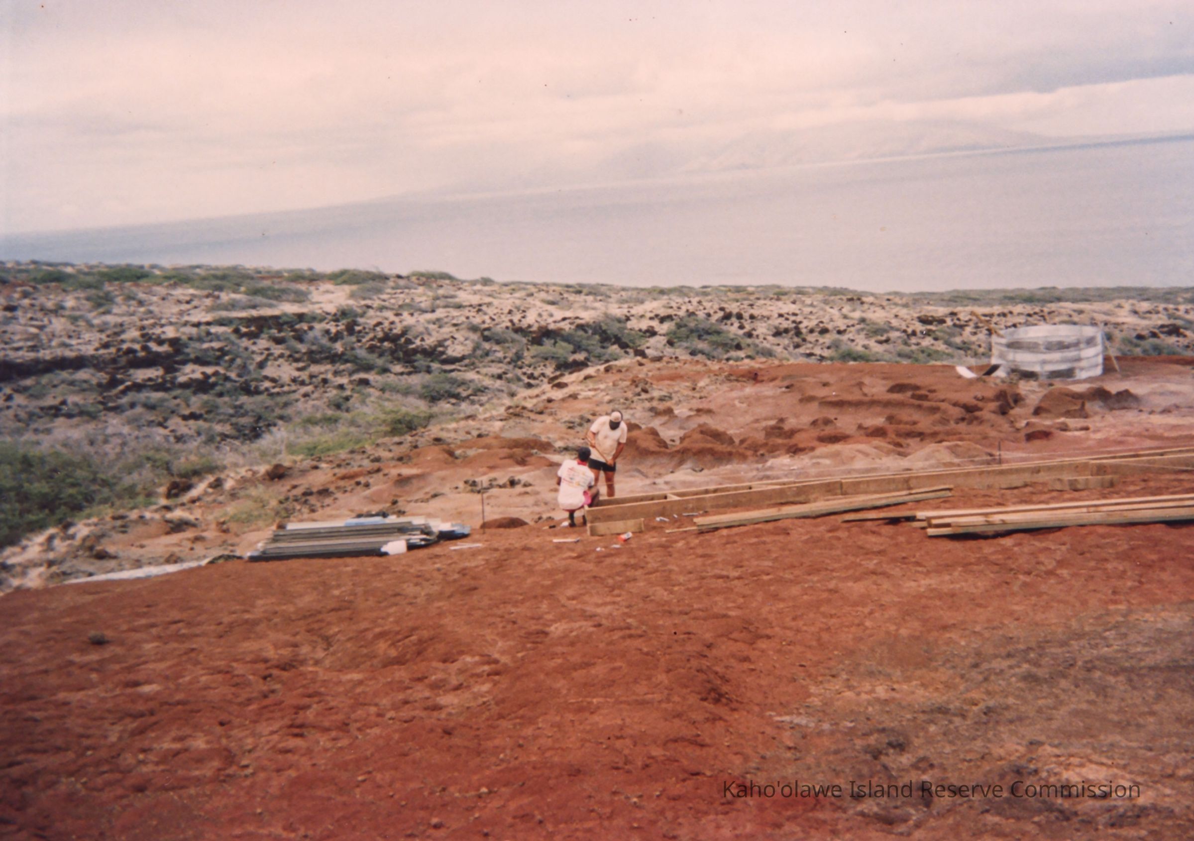 Distant view of two unidentified people working on constructing a wooden frame. There are stacks of construction material nearby and an unfinished corrugated metal circular water catchment on hardpan in the background. This photo may have been taken at Wailuna in Hakioawa 'Ili.