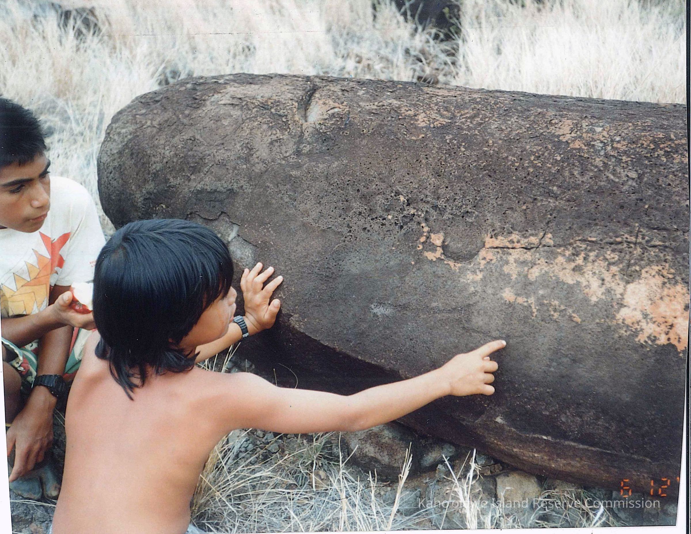 Color photo of two children looking at a petroglyph at an unidentified site, possibly the Ohana Stone.