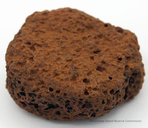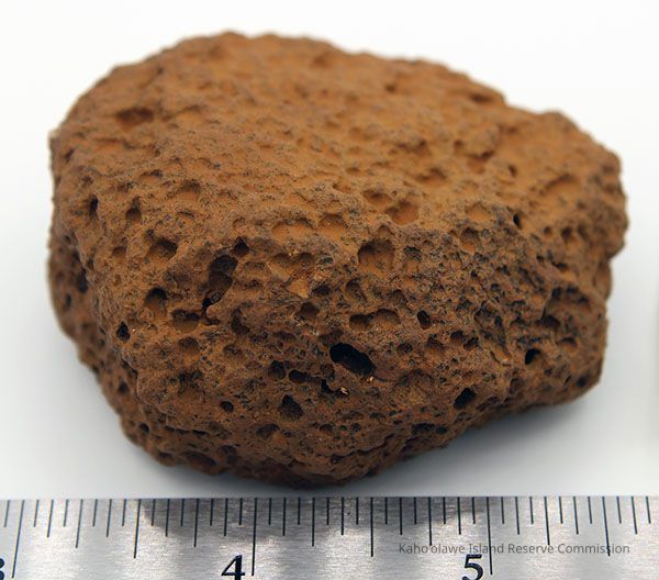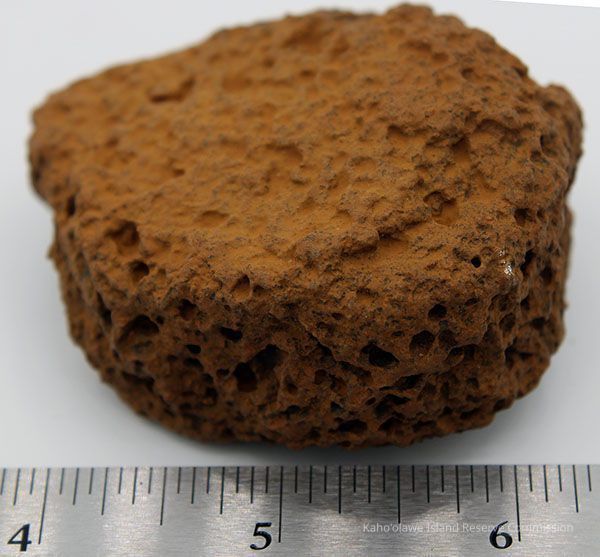 The image depicts an 'ulu maika stone, an ancient Hawaiian game piece, shown near a ruler for size reference.