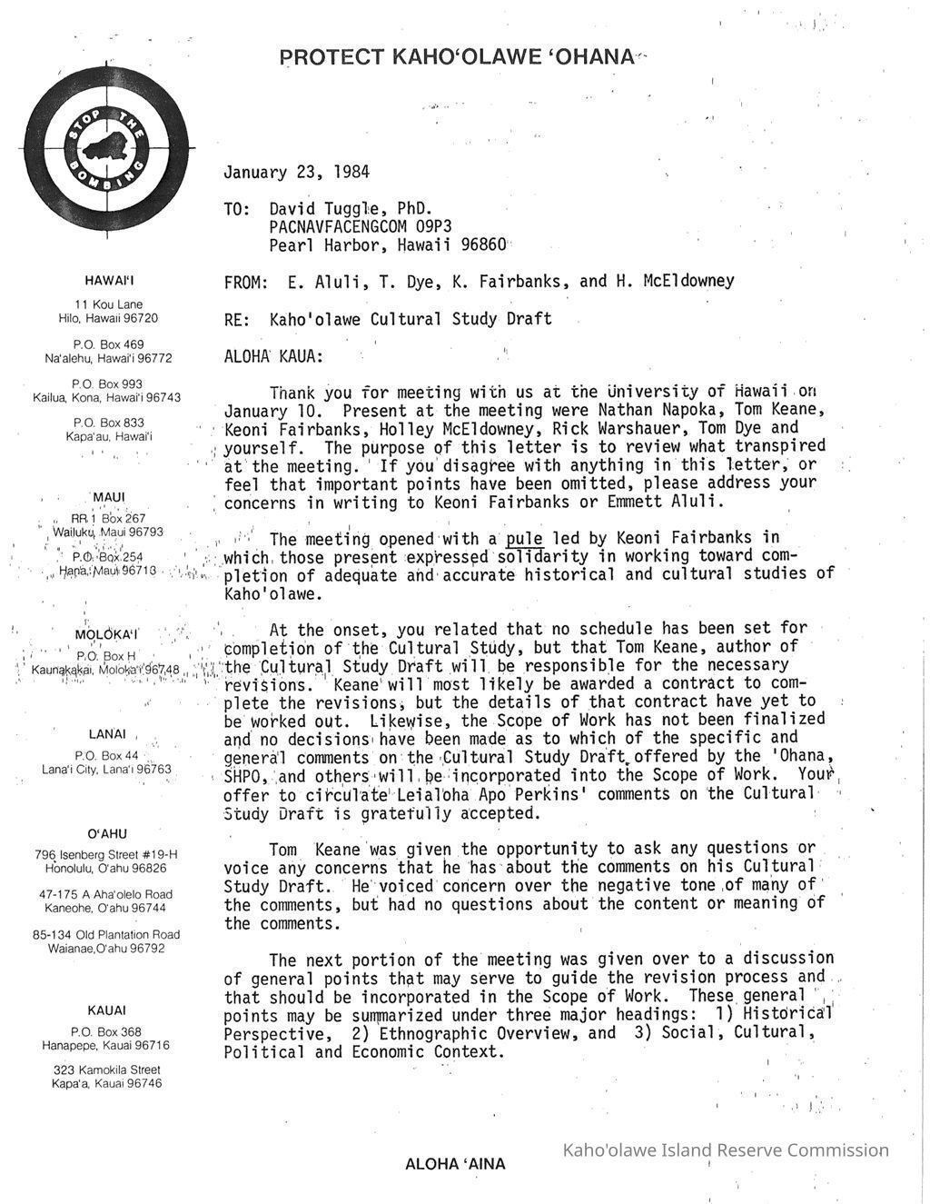Copy of memo from E. Aluli, T. Dye, K. Fairbanks and H. McEldowney to David Tuggle, PhD, PACNAVEFACENGCOM,regarding Kaho'olawe Cultural Study Draft which reviewed a meeting held at the University of Hawai'i on January 10, 1984.Subject