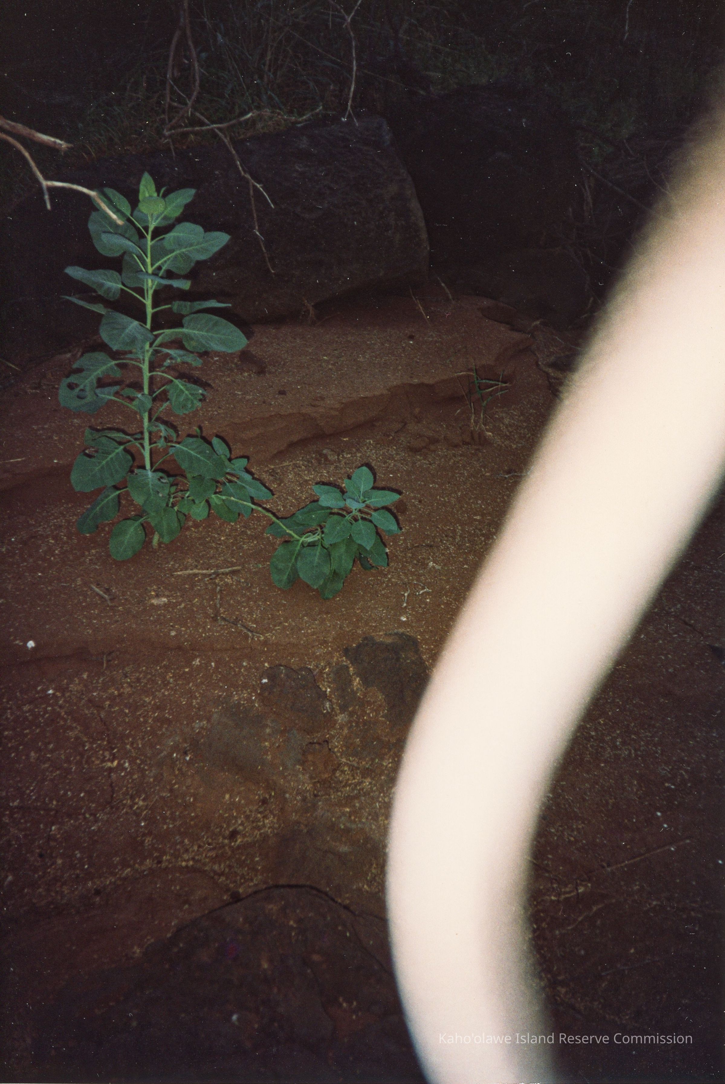 The image shows a small green plant growing on rocky, brown soil with a bright, curved blur partially covering the right side.