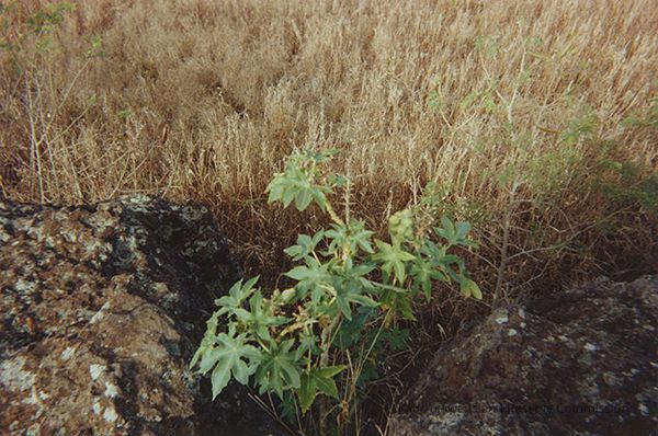 Color photo of unidentified plant (possibly castor bean) jutting out of two pokahu (rocks) in an unidentified area.Collection