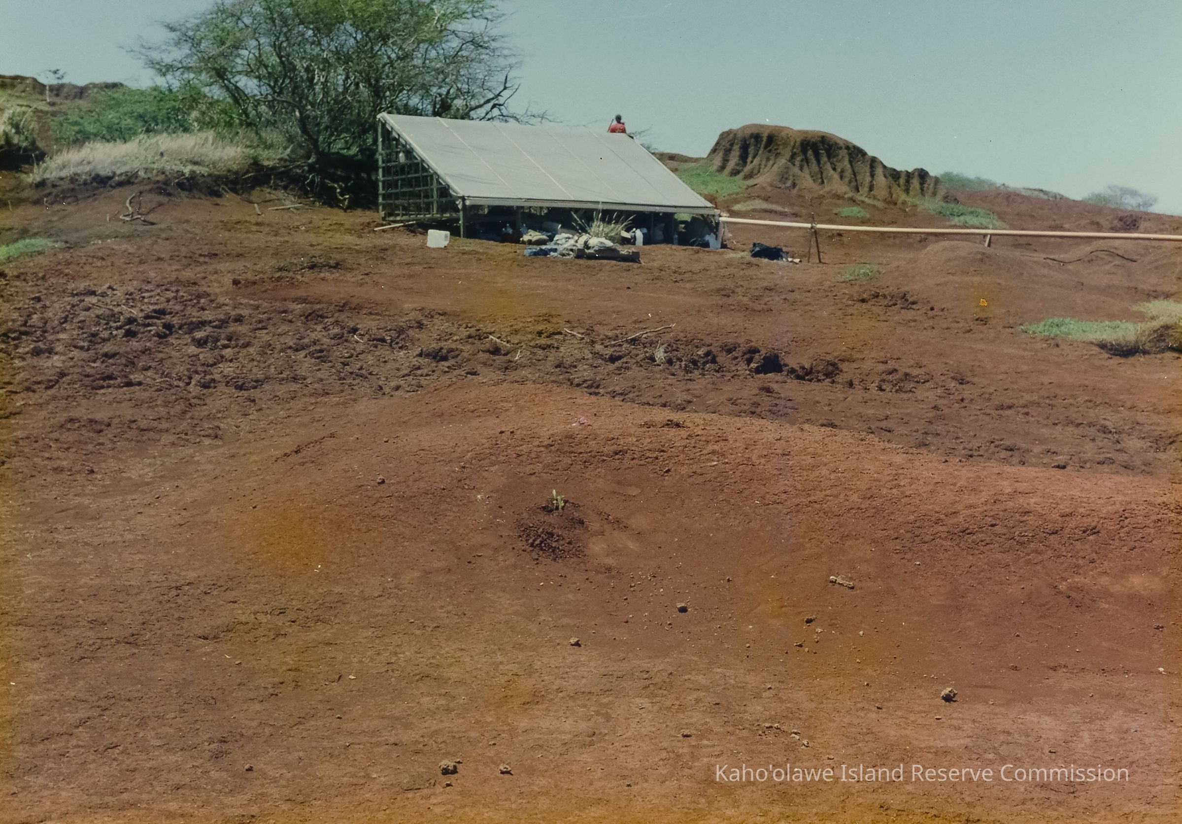 The image shows an expansive red dirt terrain dominated by a shaded structure, with sparse vegetation and mounds in the background under a clear sky.