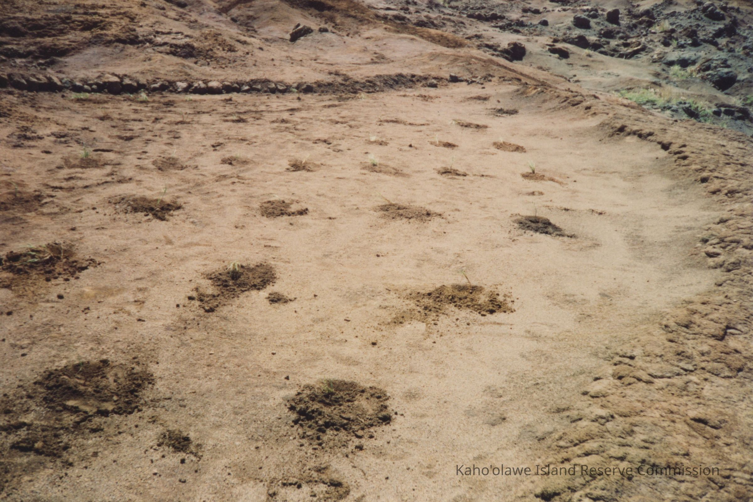 The image depicts rows of plants with a hardpan surface, scattered with sparse vegetation and small, uneven patches.