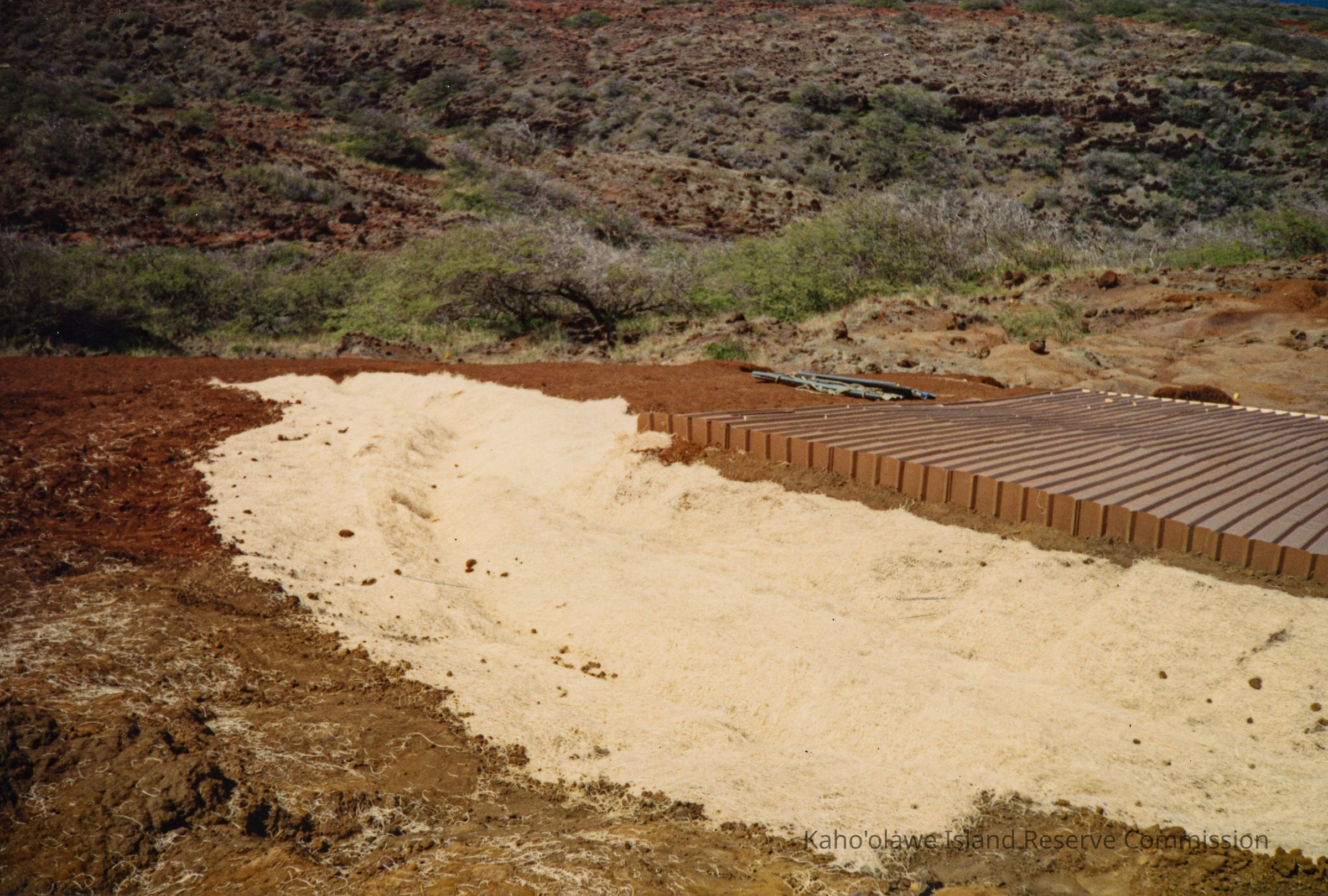 The image depicts a landscape featuring a hardpan area with a layer of matting material spread across the soil, arranged beside a constructed platform.