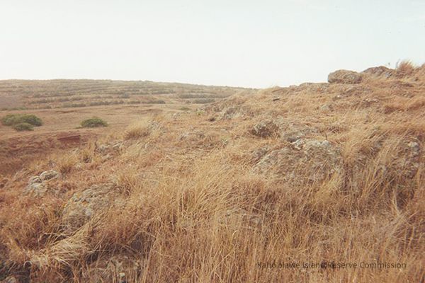 Color photo of a grouping of pohaku (stones/rocks) with plants interspersed between them. The middle pohaku formation may be the navigator's chair.Collection