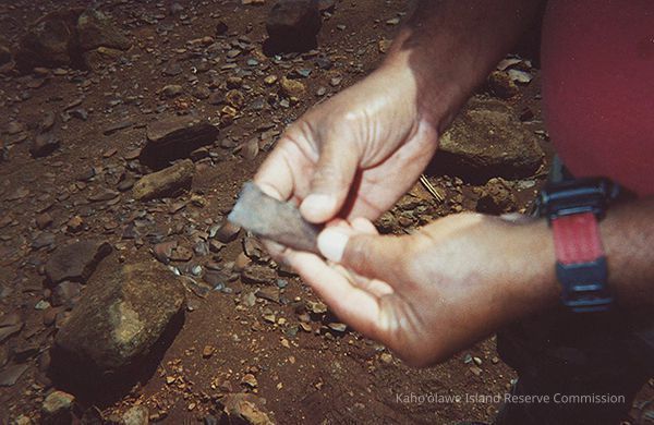 Color photo of an unidentified person holding a potential adze or adze preform at a potential archaeological site. The site may be located at Pu'umoiwi.Collection