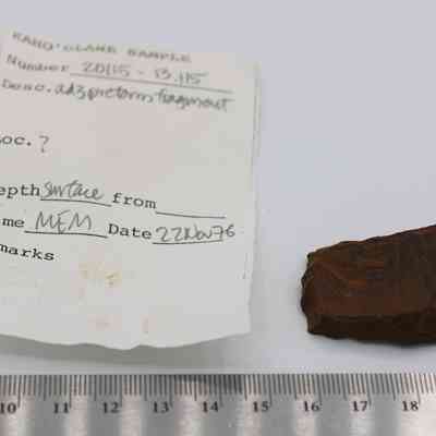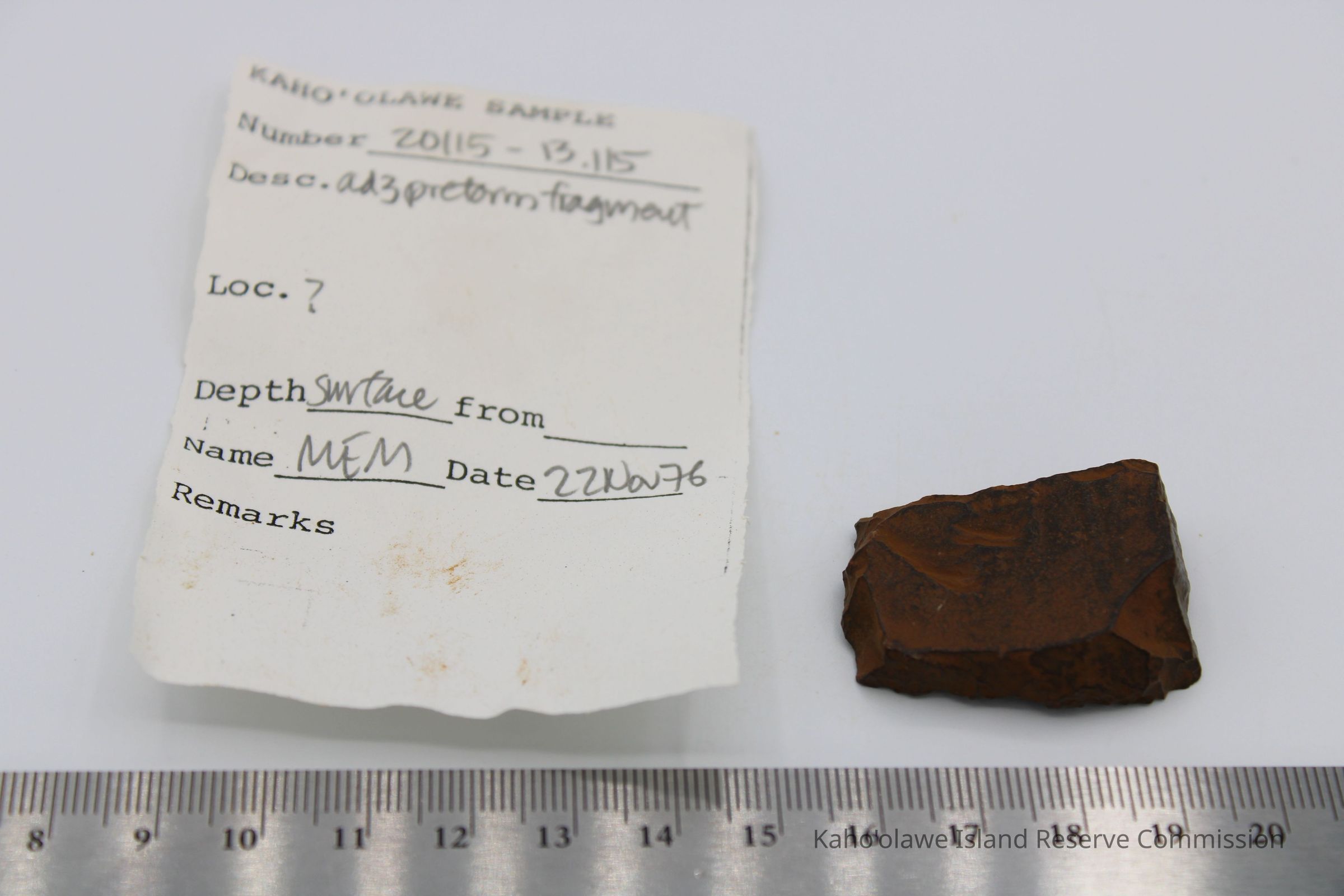 Adze preform above ruler: The image depicts a rough, brown stone adze preform placed next to a ruler for scale.