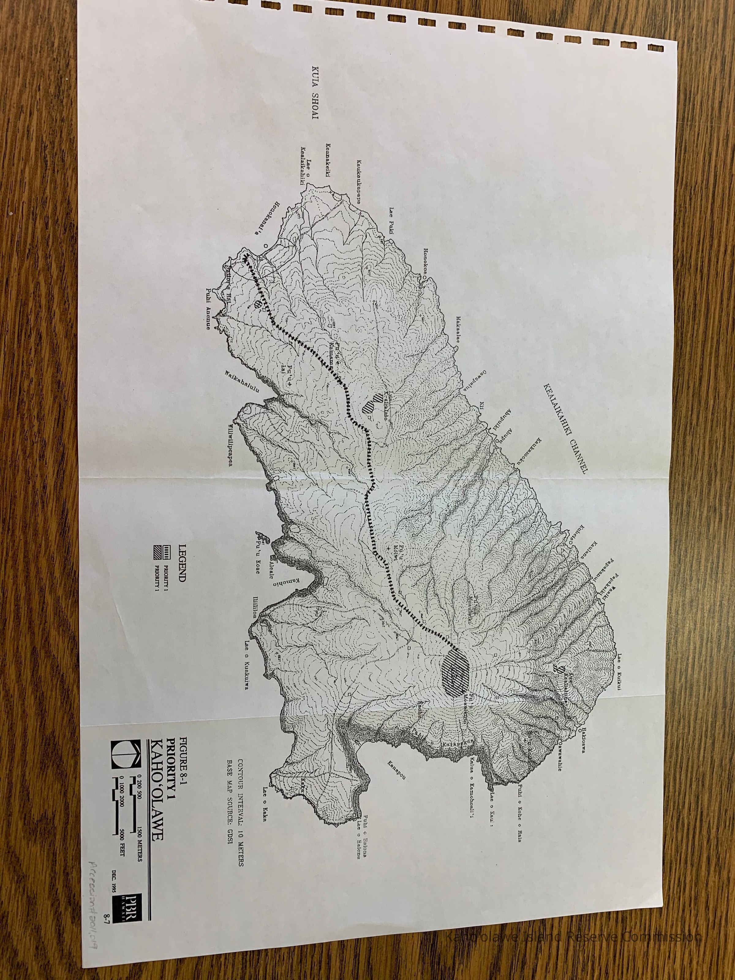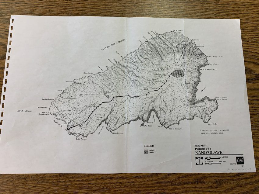 Map of Kaho'olawe indicating Priority 1 areas. Map is labeled Figure 8-1 of unknown publication, contains place names and contour intervals of 10 meters.Collection