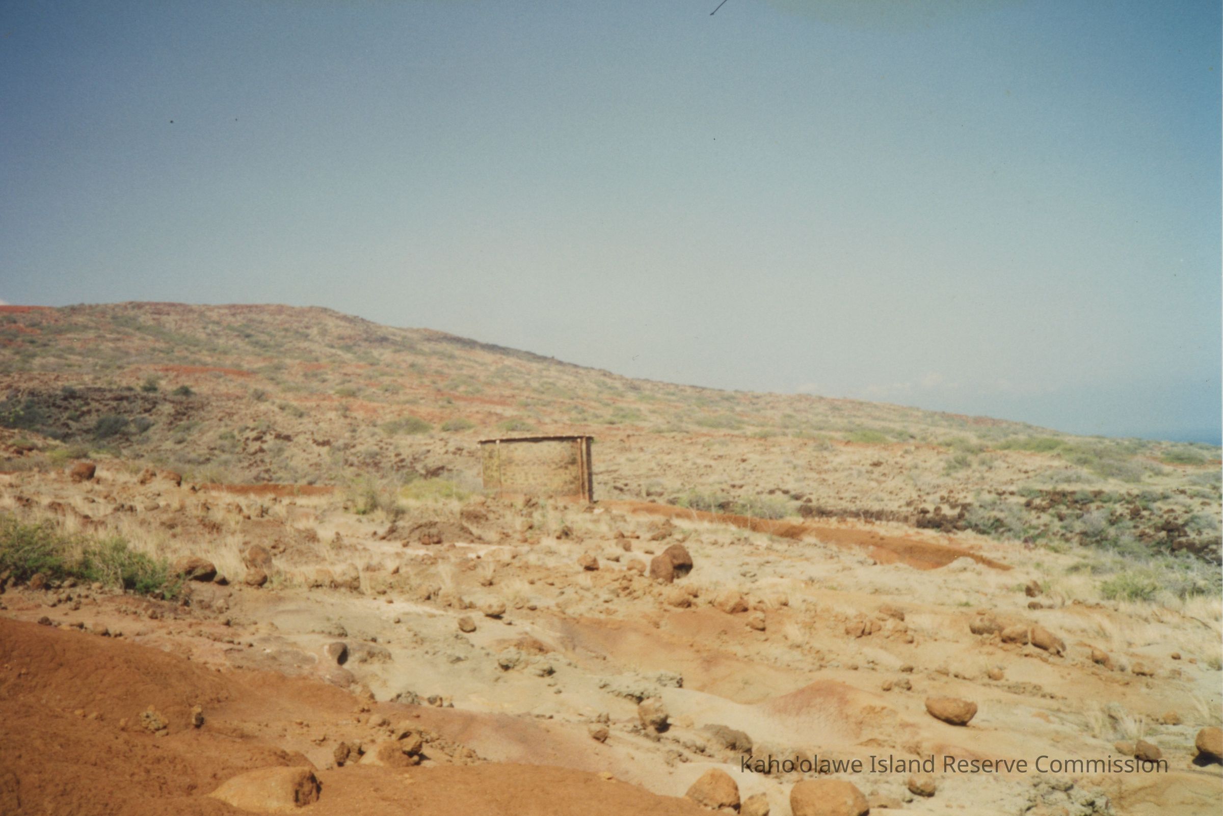 Distant profile view of a rusty water storage tank on hardpan terrain with a hill in the background. Caption written on original photo album sleeve: "Bye-bye Tank!"