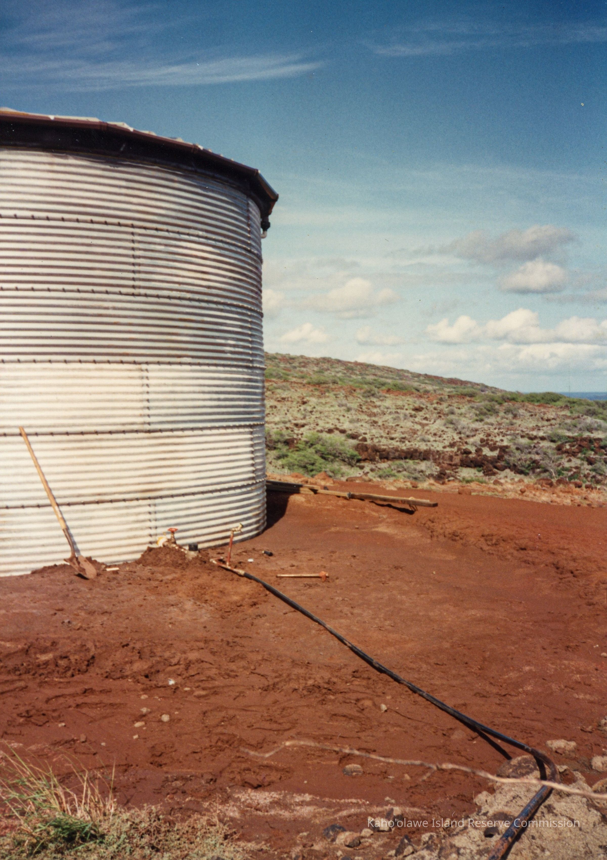 Color photograph of the profile of a corrugated metal water tank situated on hardpan terrain. An irrigation line and valve are attached to it.