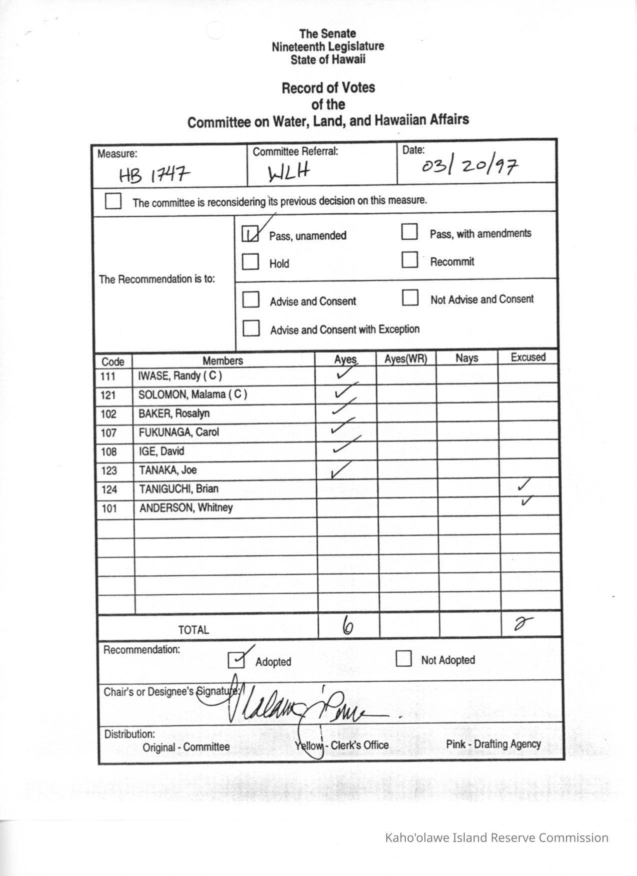 Record of Votes of the Committee on Water, Land, and Hawaiian AffairsDescription