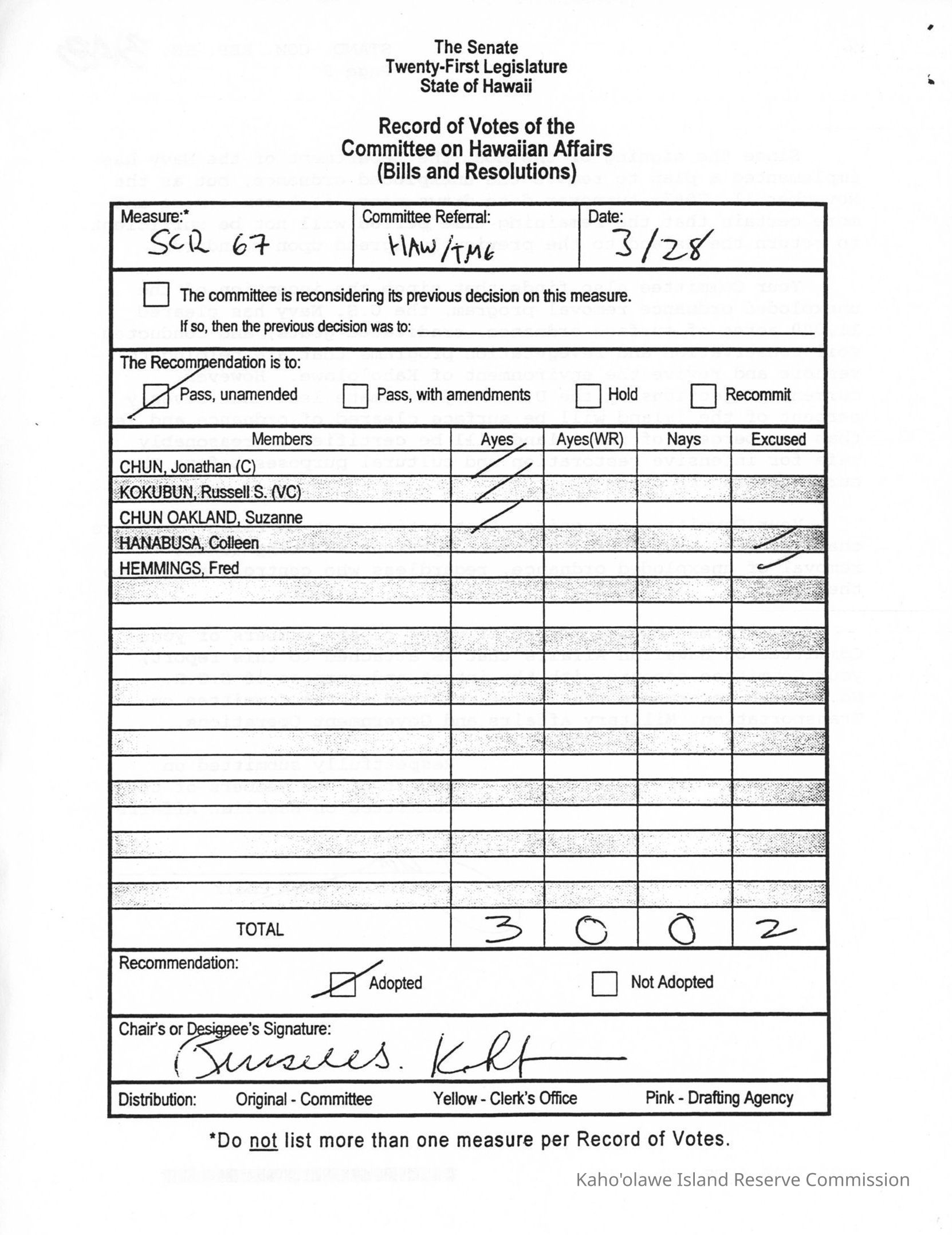 Copy of The Senate, Twenty-First Legislature, State of Hawaii, Record of Votes of the Committee on Hawaiian Affairs (Bills and Resolutions) for SCR (Senate Concurrent Resolution) 67. One copied letter size page (back to back with Standing Committee Report No. 3148 (KIRC Object ID #2015.012.27) and filed with Notice of Hearing (KIRC Object ID #2015.012.29).Creator