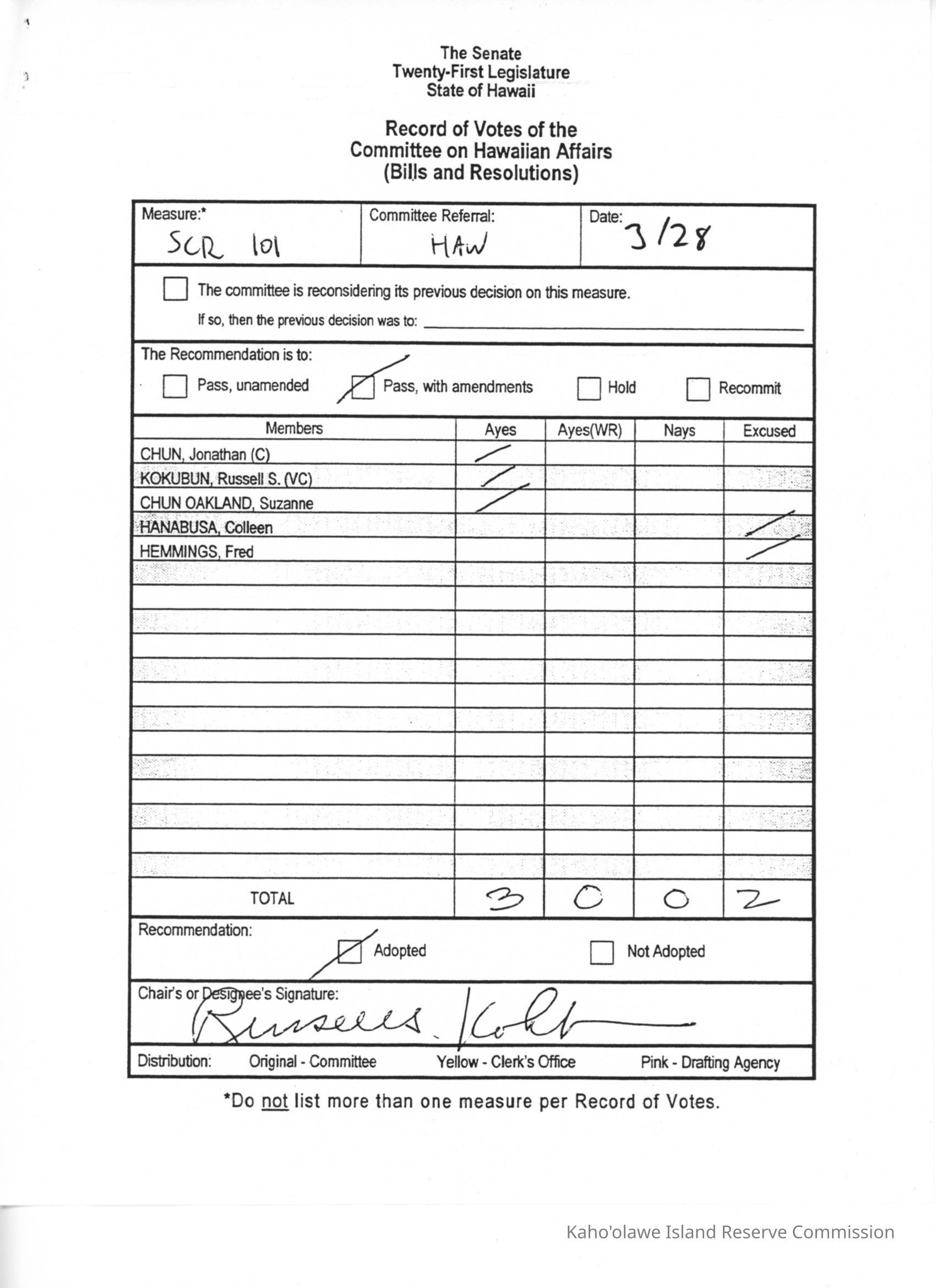 Copy of The Senate, Twenty-First Legislature, State of Hawaii, Record of Votes of the Committee on Hawaiian Affairs (Bills and Resolutions) for SCR 101.Creator