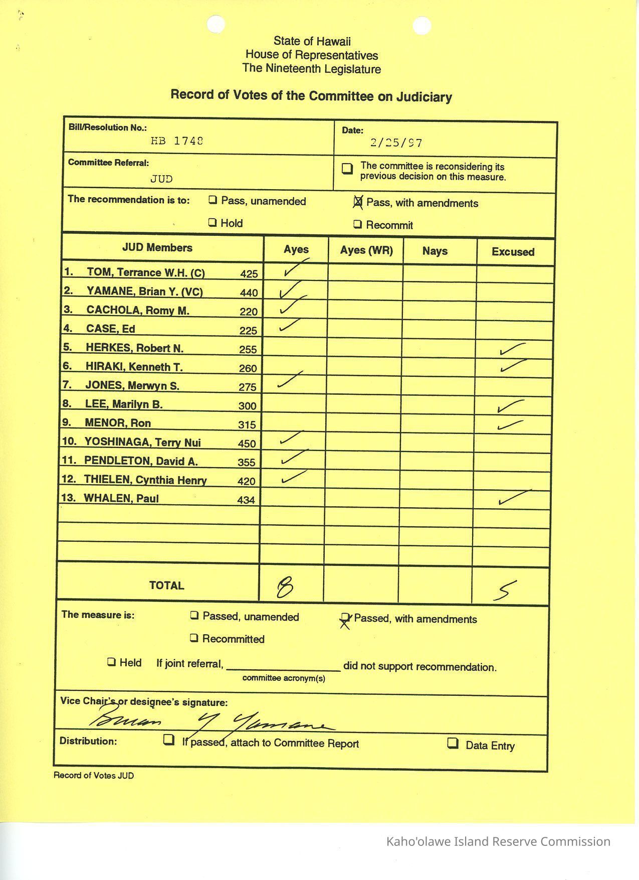State of Hawaii, House of Representatives, the Nineteenth Legislature, Record of Votes of the Committee on Judiciary for HB 1748.Creator