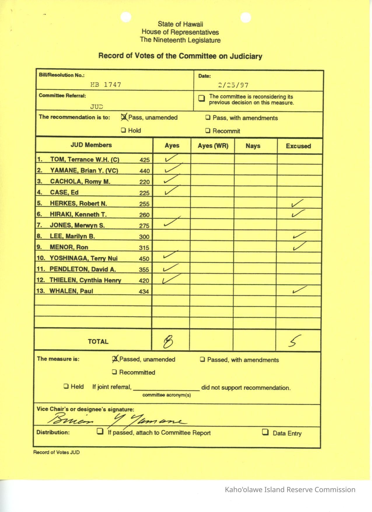State of Hawaii, House of Represenatives, The Nineteenth Legislature, Record of Votes of the Committee on Judiciary for HB 1747. The Committee passed the measure, unamended.Creator