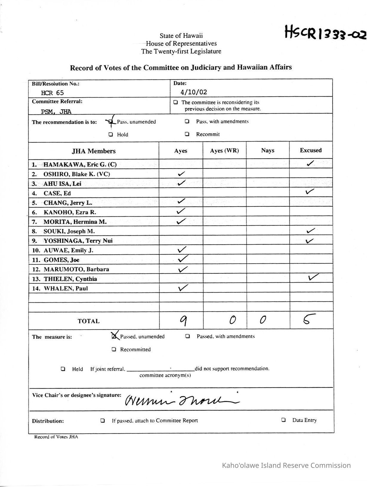Copy of State of Hawaii, House of Representatives, The Tweny-First Legislature, Record of Votes of the Committee on Judiciary and Hawaiian Affairs for HCR 65. House Committee on Judiciary and Hawaiian Affairs passed the measure unamended.