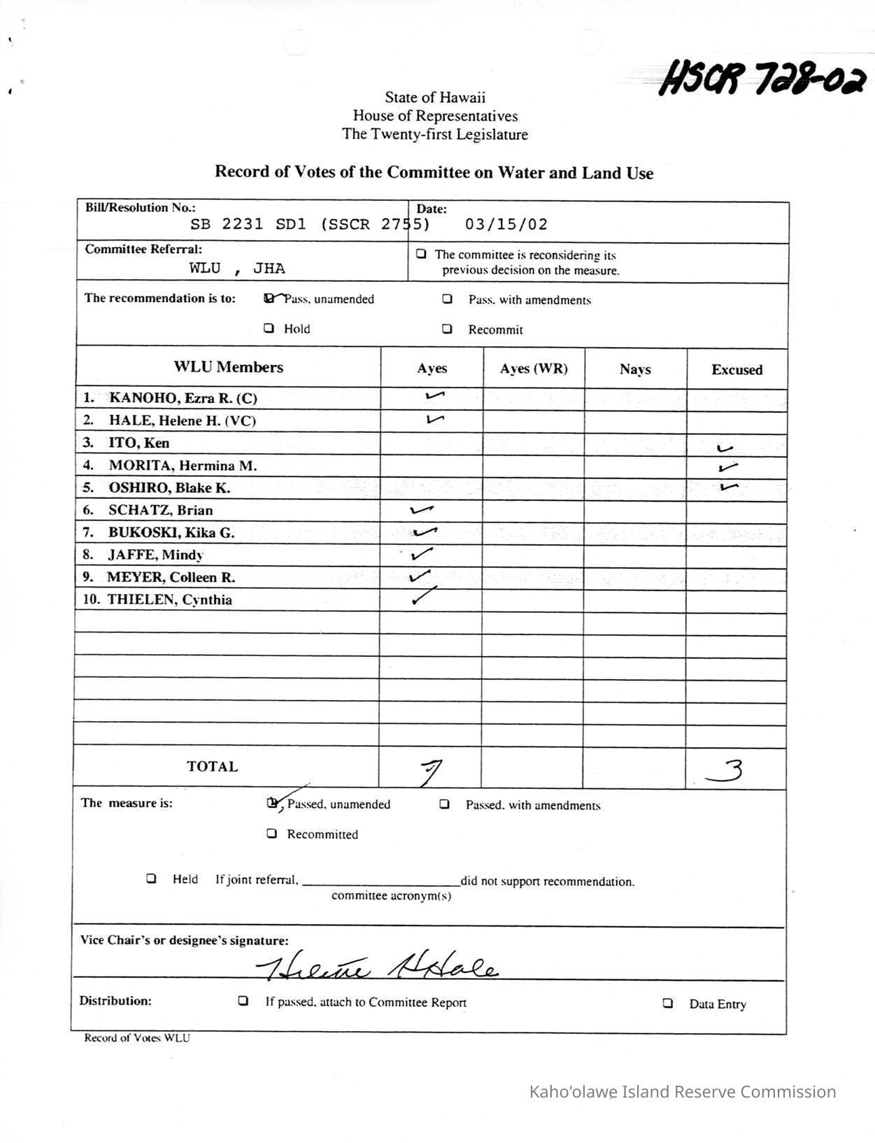 Copy of State of Hawaii, House of Representatives, The Twenty-first Legislature, Record of Votes of the Committee on Water and Land Use for SB (Senate Bill) 2231 SD (Senate Draft) 1 (SSCR [Senate Standing Committee Report ] 2755). One copied letter size page.Creator