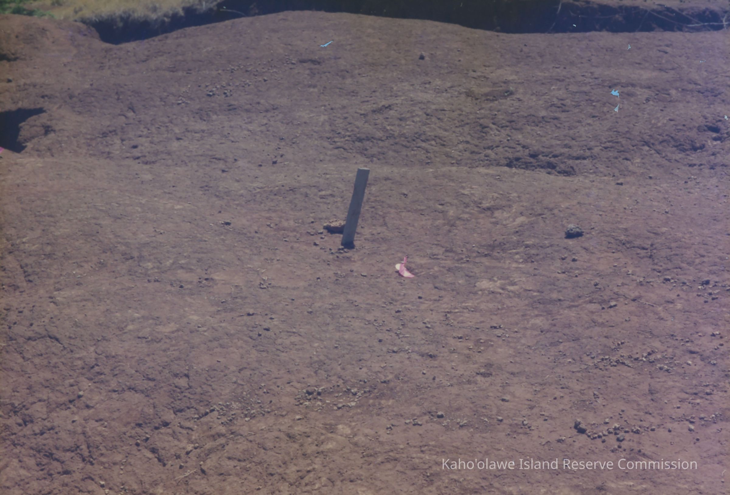 Color photo of a wooden stake on a hard pan surface next to a piece of coral and a red flag near by.Photograph Details