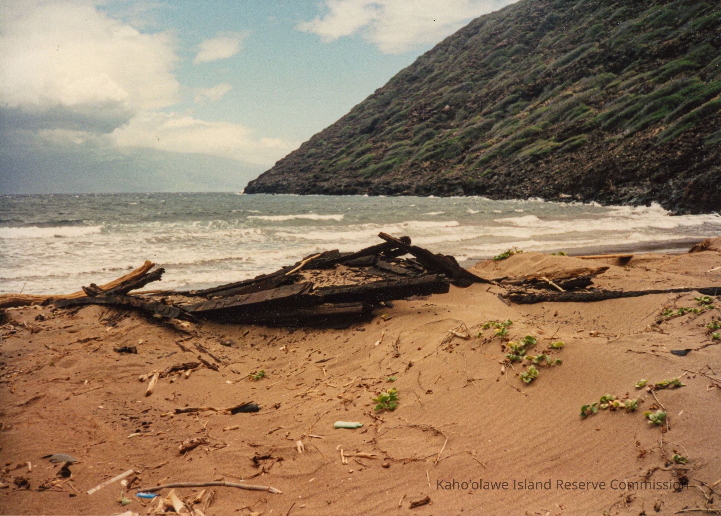 The image depicts the remains of metal railroad ties with greenery and a mountainous backdrop under a cloudy sky.